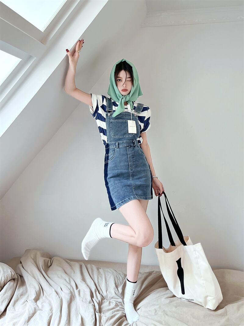 色:ストライプトップ,デニムスカート
