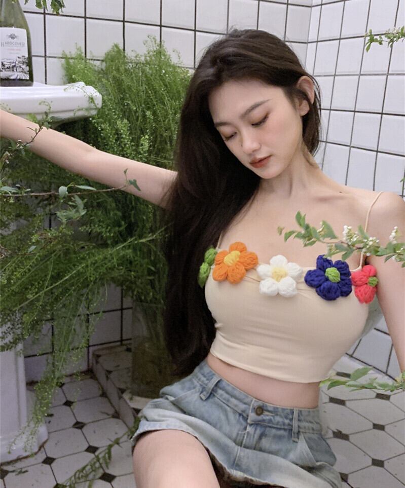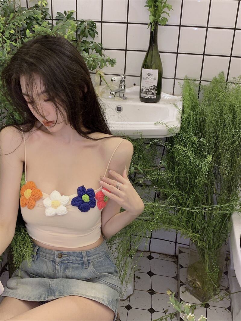 女性の夏の短いセクションの内側にキャミソールを備えた立体的な花甘いセクシーな純粋な欲望ボトミングシャツアウタートップ ショート 大人ガーリー スウィート キュート カジュアル サマー 夏物 ピュア フラワーデザイン bstraw65726399943 | beaute25