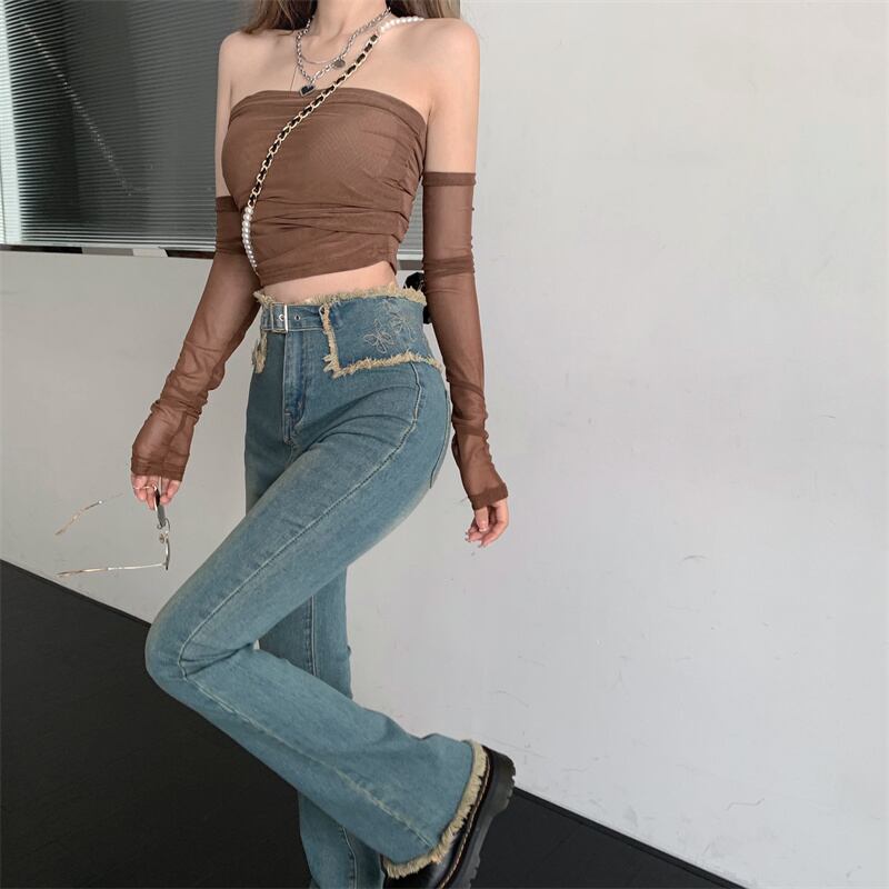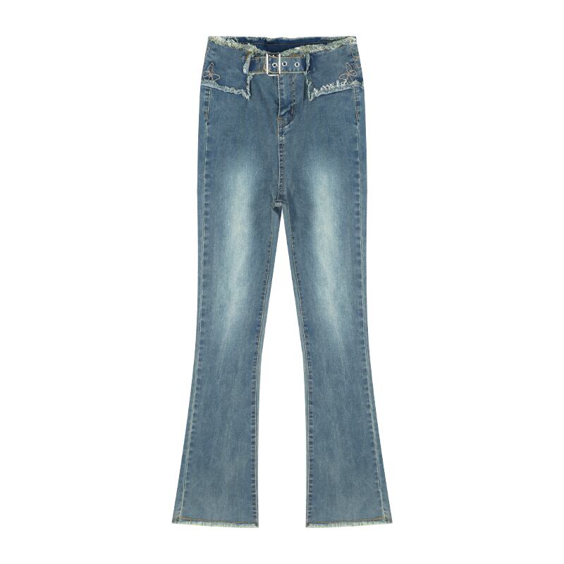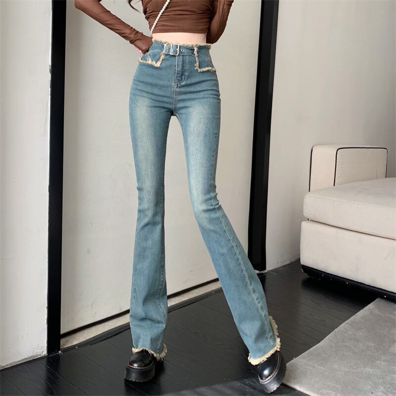 生のエッジのホースシュージーンズの女性のイントレンディなニッチハイウエストスリムフィットパンツ夏のワイドレッグフレアパンツ レッド サマー 夏物 bstraw91378893088 | beaute25