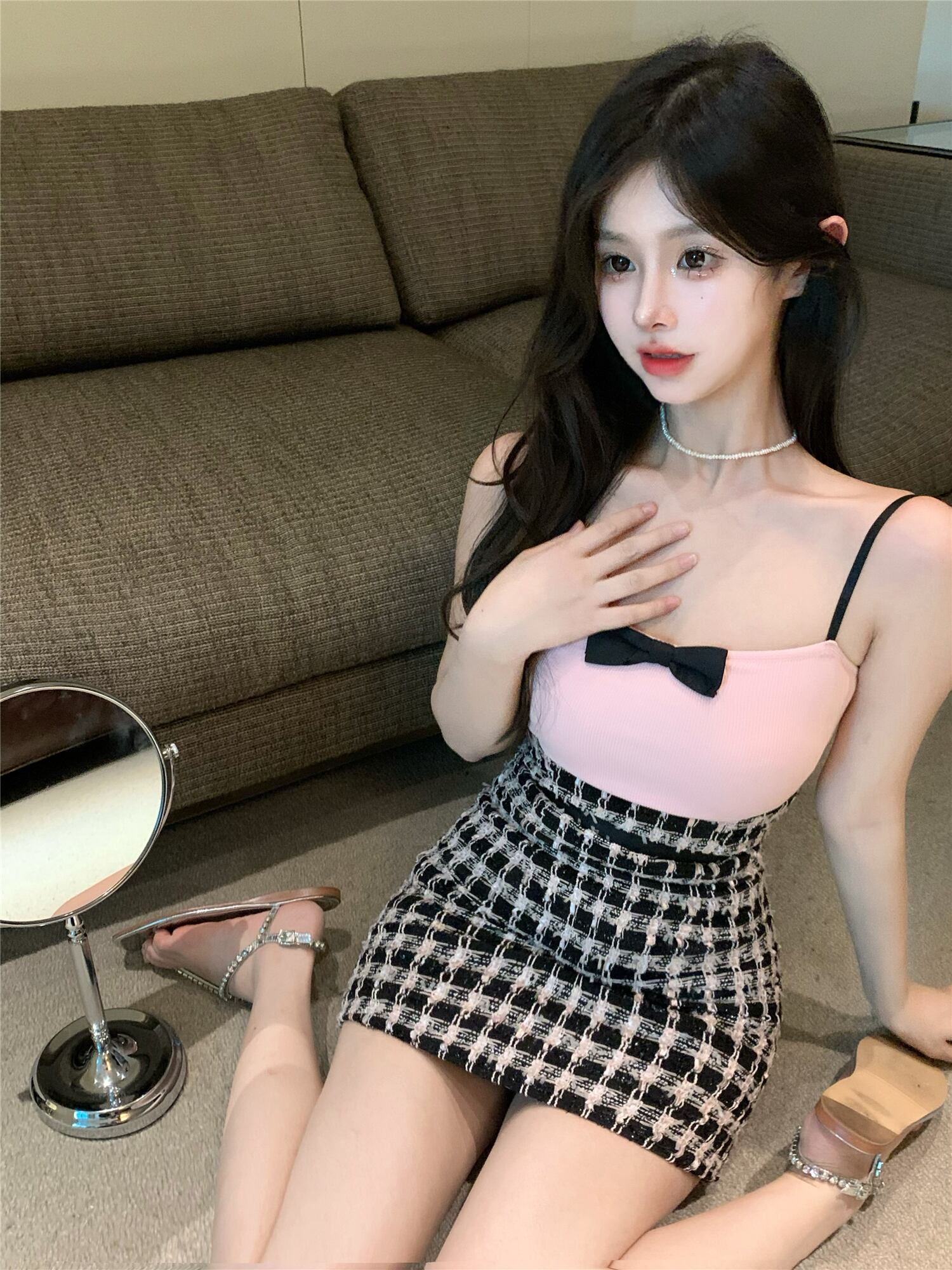 チェック柄の弓サスペンダードレス女性の夏のノースリーブ気質セクシーなステッチ露出バックパックヒップショートスカート リボン サマー 夏物 リュック bstraw99504309734 | beaute25