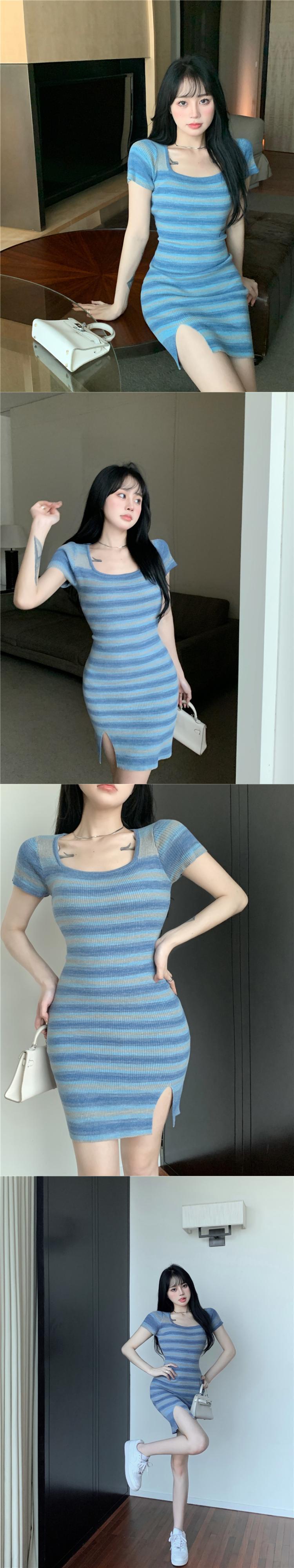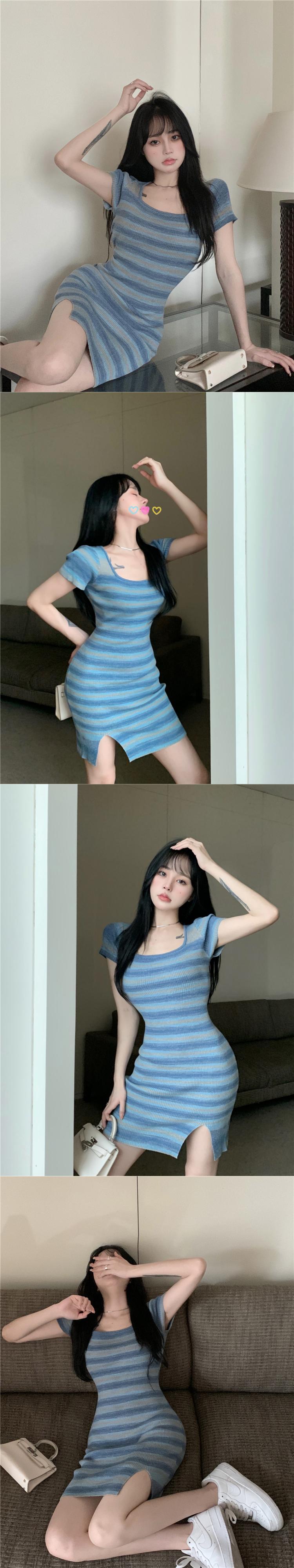 純粋な欲望甘くてスパイシーなセクシーな青い縞模様のドレス女性の夏2022新しいスカートタイトバッグヒップスリットスカート ブルー 大人ガーリー スウィート キュート カジュアル サマー 夏物 ストライプ bstraw66886361152 | beaute25