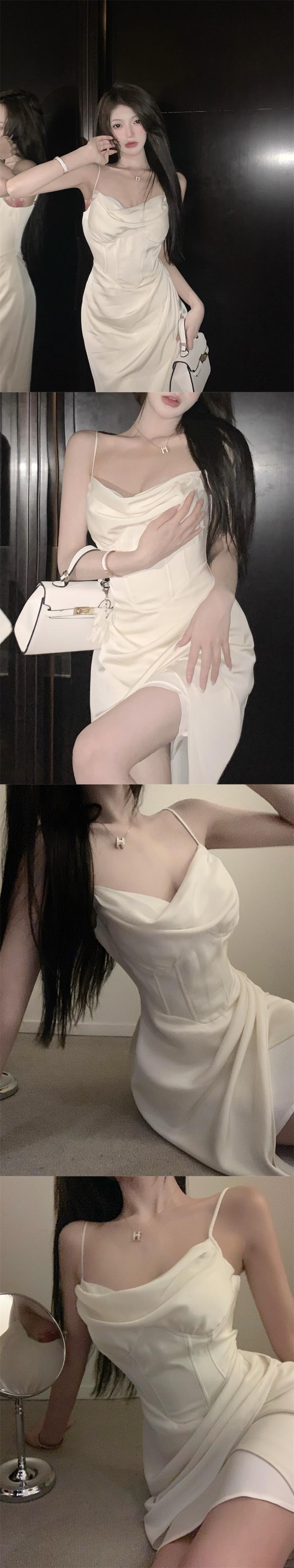 フレンチスタイルのスプリットサスペンダードレス女性の夏の純粋な欲望風セクシーな背中の開いた気質ミドル丈ウエストスリムスカート サマー 夏物 ピュア bstraw24149803345 | beaute25