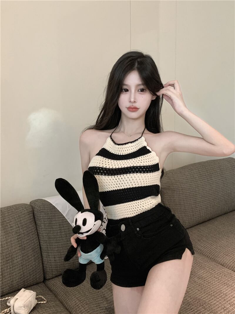 甘いベイビーストライプの小さなキャミソール女性の夏の純粋な欲望風ぶら下がっている首オフショルダータイトフィットとトップとアウターウェアの内側に薄い 大人ガーリー スウィート キュート カジュアル サマー 夏物 ピュア bstraw2915406594 | beaute25