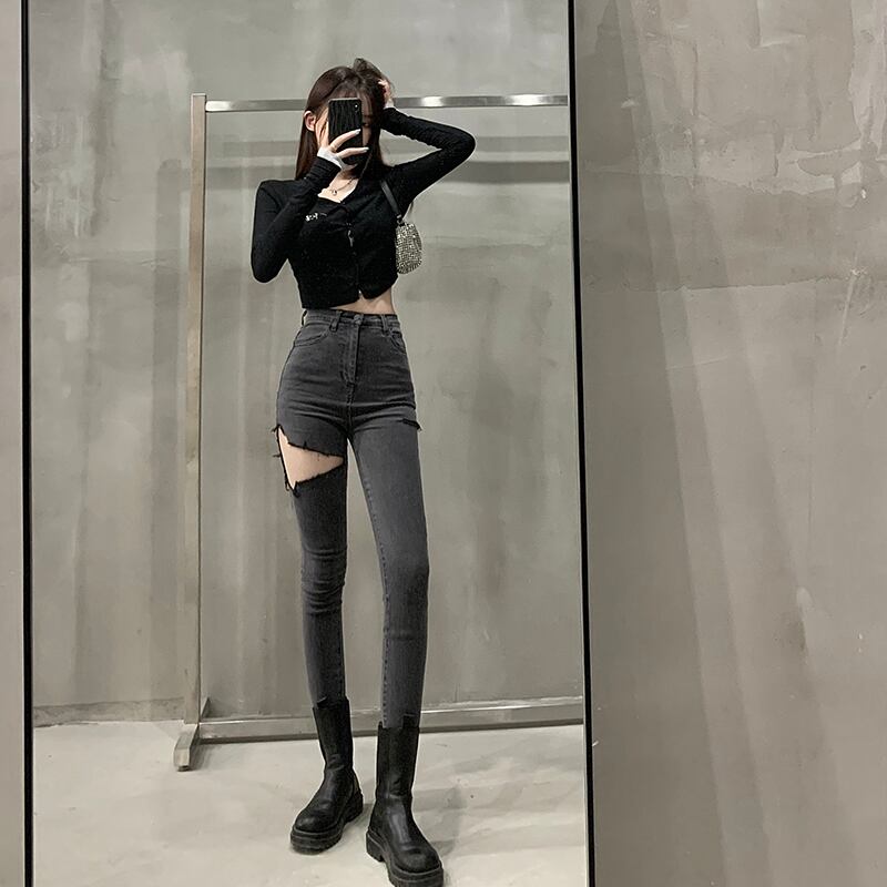 スモークグレーの破れたジーンズの女性の夏のハイウエストタイトな伸縮性のあるズボン2022小さな足の新しいペンシルパンツ ハイウェスト エラスティック サマー 夏物 bstraw39665446916 | beaute25