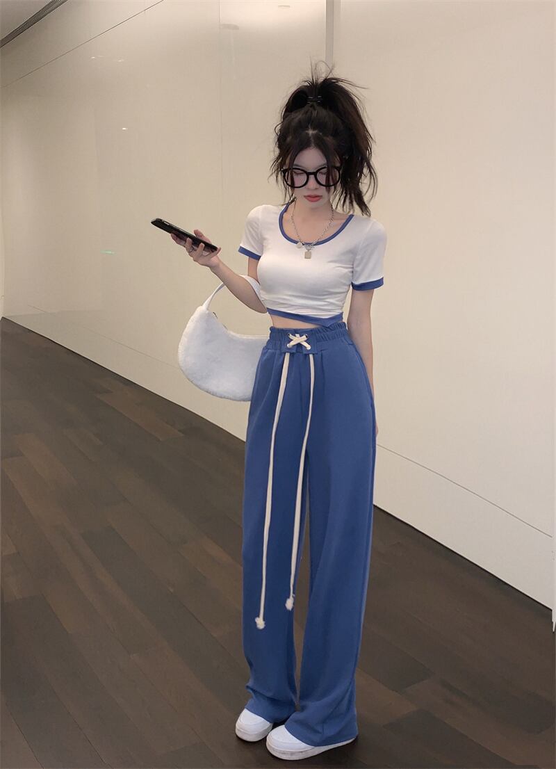 色:白と黒のTシャツ,白と青のTシャツ,黒いスラックス,ブルーカジュアルパンツ