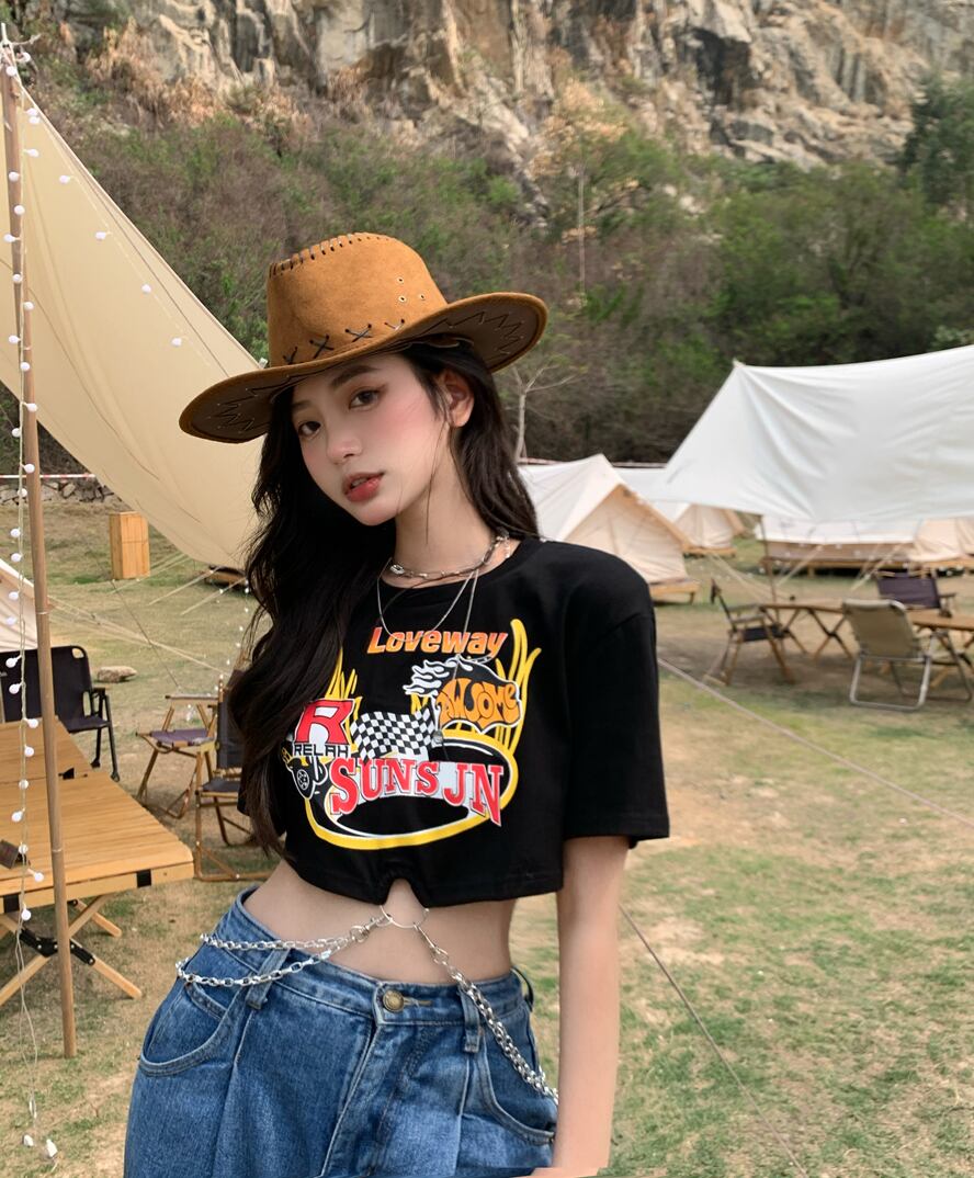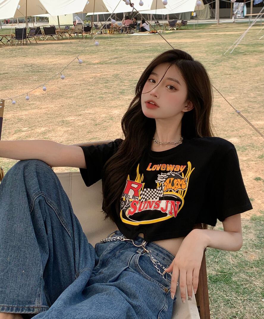 ヨーロッパとアメリカのレトロなオールマッチインタイドTシャツ女性の夏のデザインセンスチェーンショートセクションへそ黒半袖トップ ブラック サマー 夏物 ヨーロピアン bstraw31011942533 | beaute25