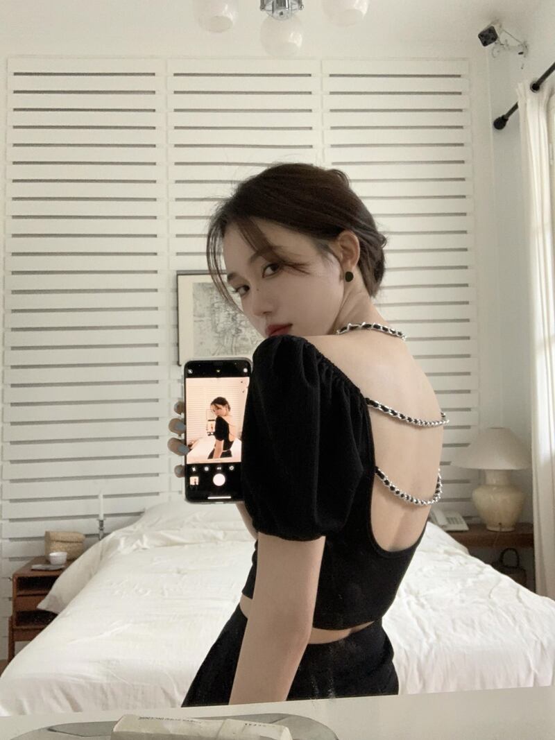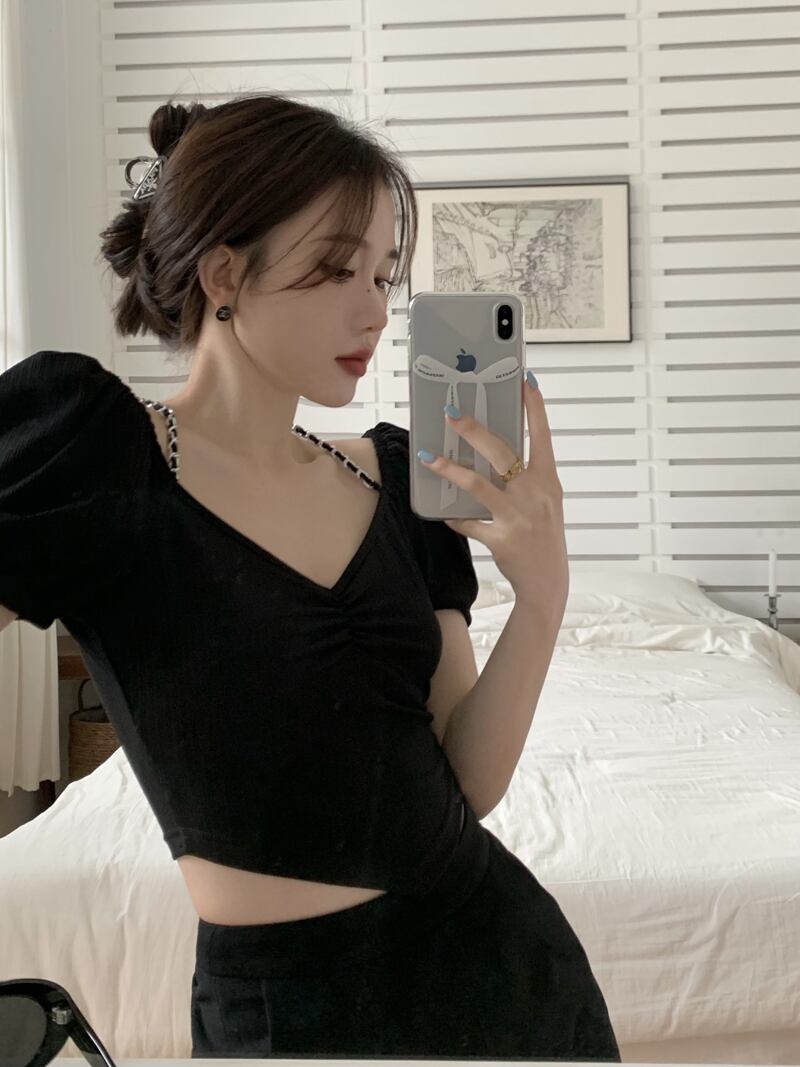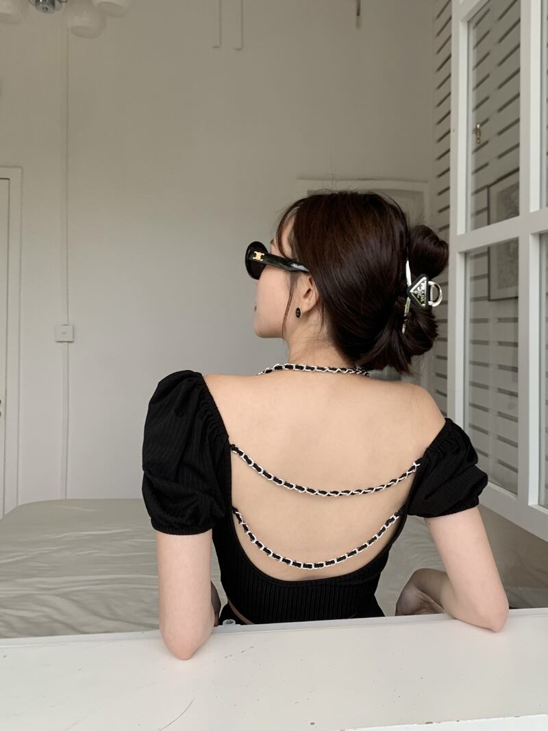 パフスリーブホルターネックTシャツレディースイントレンディな夏の不規則な黒の背中の開いたセクシーなチェーンスリムショートトップ ブラック サマー 夏物 bstraw54475507012 | beaute25
