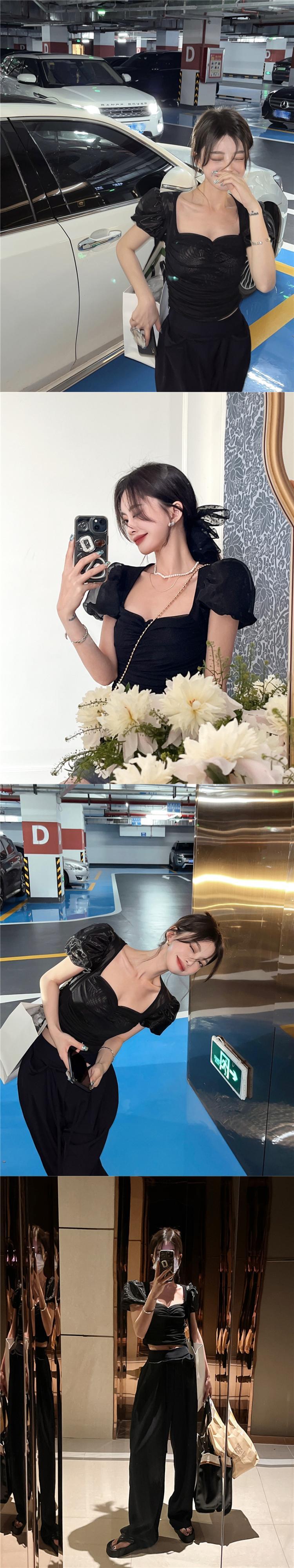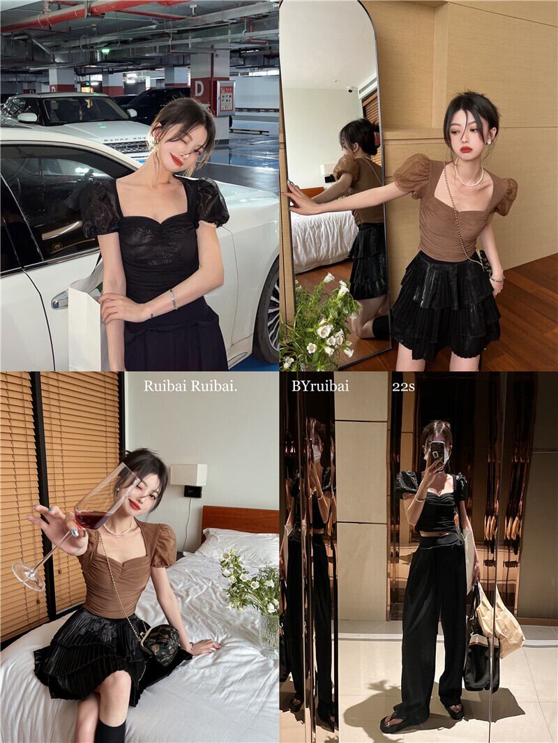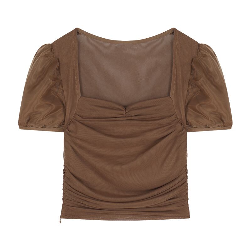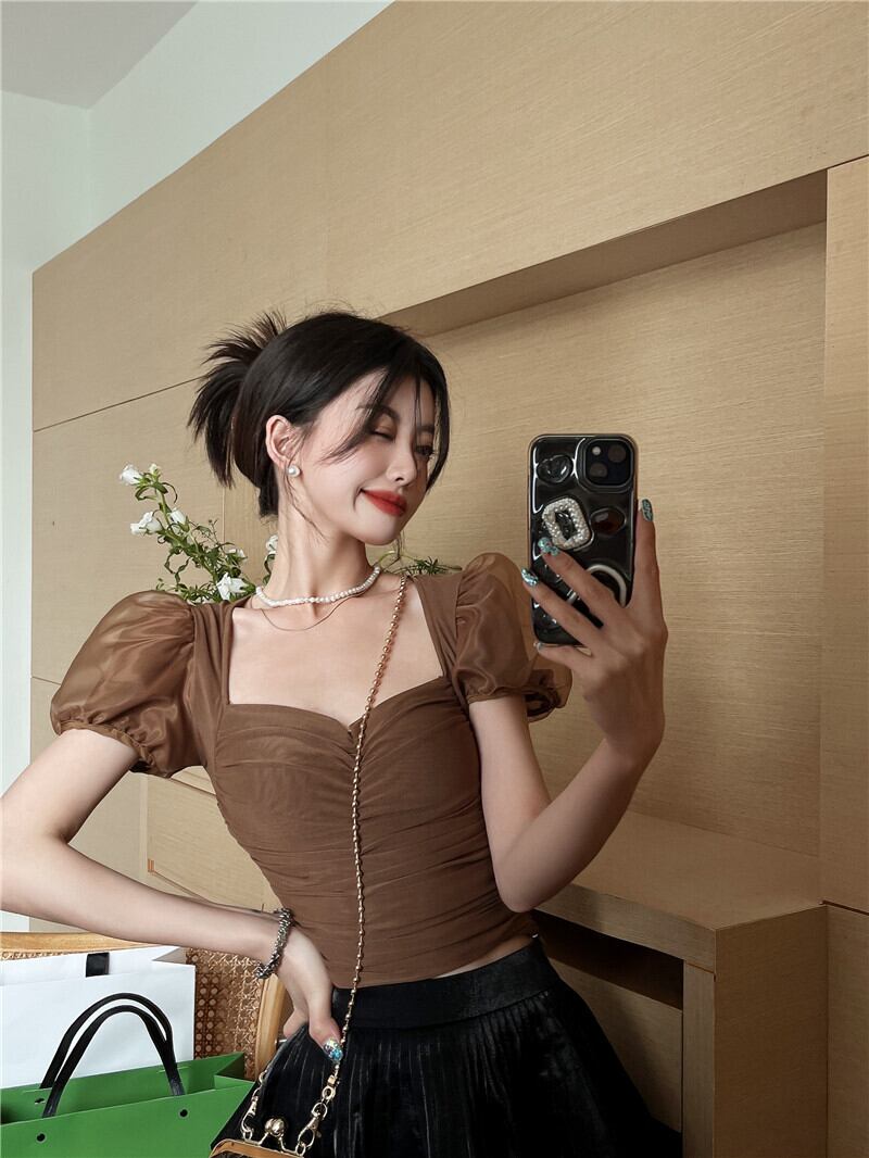 スクエアネック半袖Tシャツ女性の夏の純粋な欲望メッシュパフスリーブスリムフィットショートトップボトミングシャツ サマー 夏物 ピュア スクウェア bstraw47044382094 | beaute25