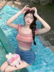 ピュアデザイーンウィンドストライプニットTシャツ女子2022年夏新作スウィートシンスリムスリムスリム半袖トップス 大人ガーリー キュート カジュアル サマー 夏物 bstraw78731716904 | beaute25