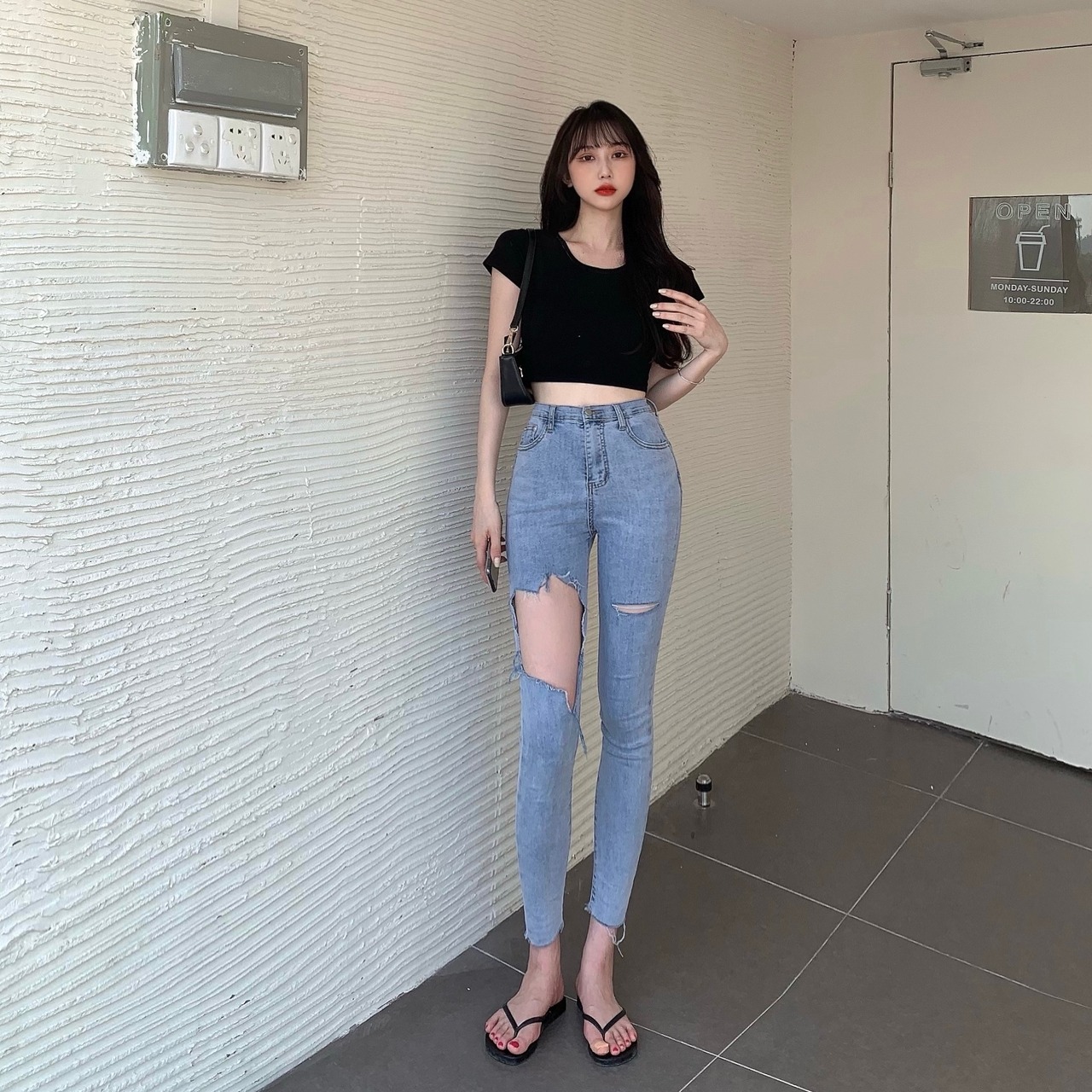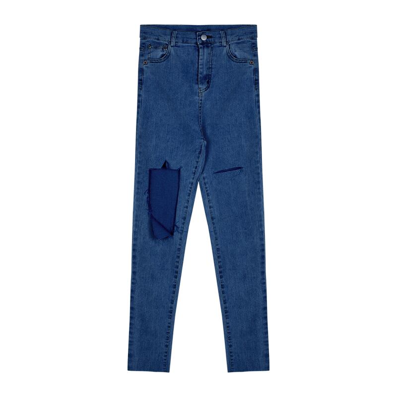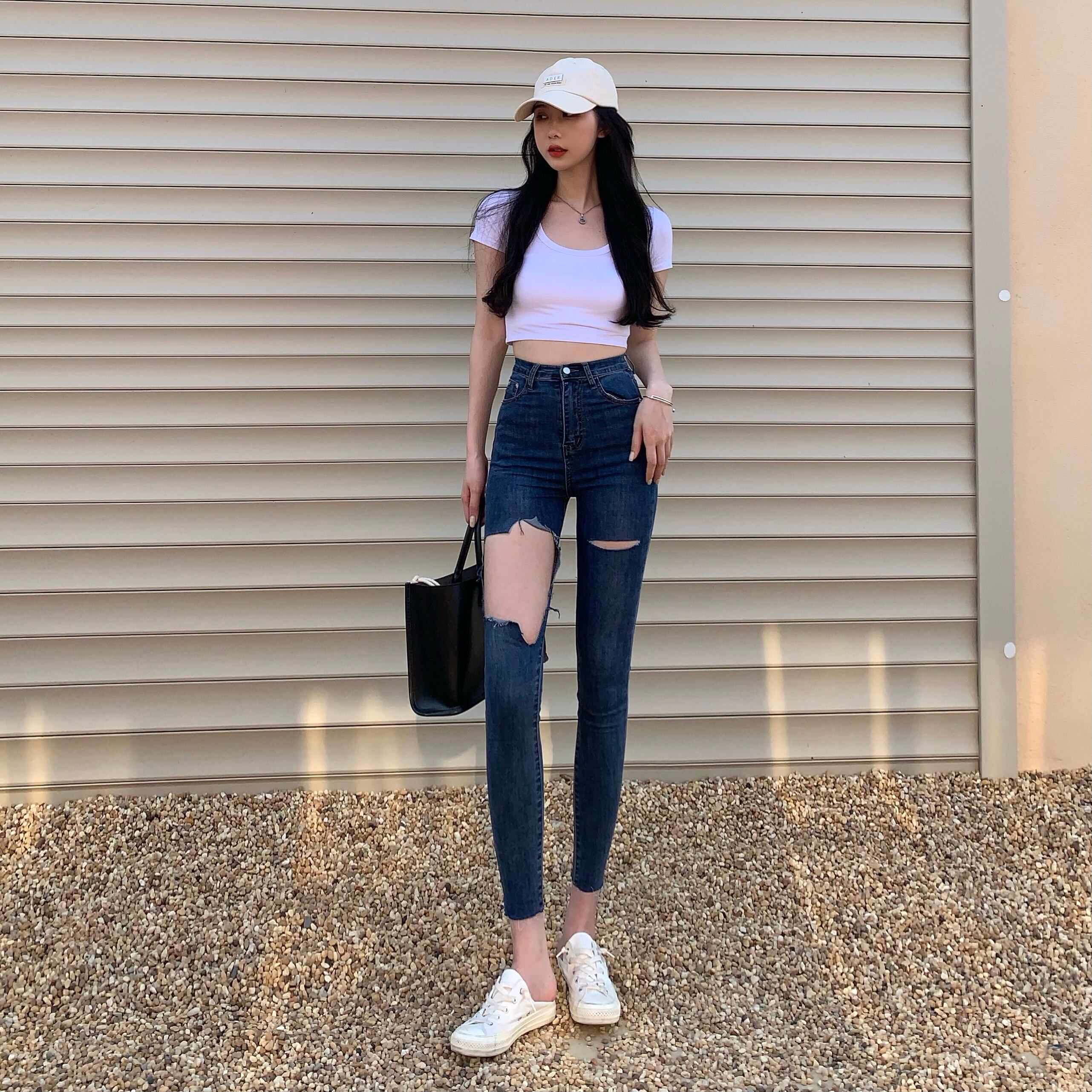 破れた穴の生のエッジジーンズ女性の夏のハイウエストタイトな伸縮性のある薄い9ポイントのズボン大根ペンシルパンツ ハイウェスト エラスティック サマー 夏物 bstraw10262596167 | beaute25
