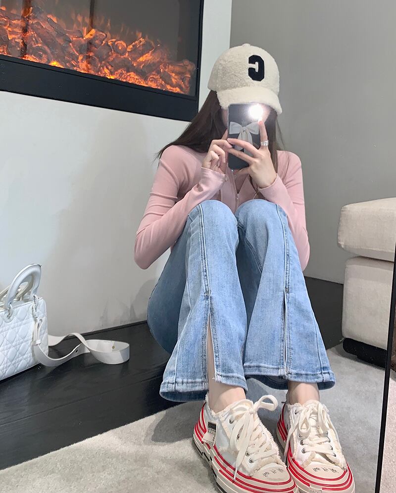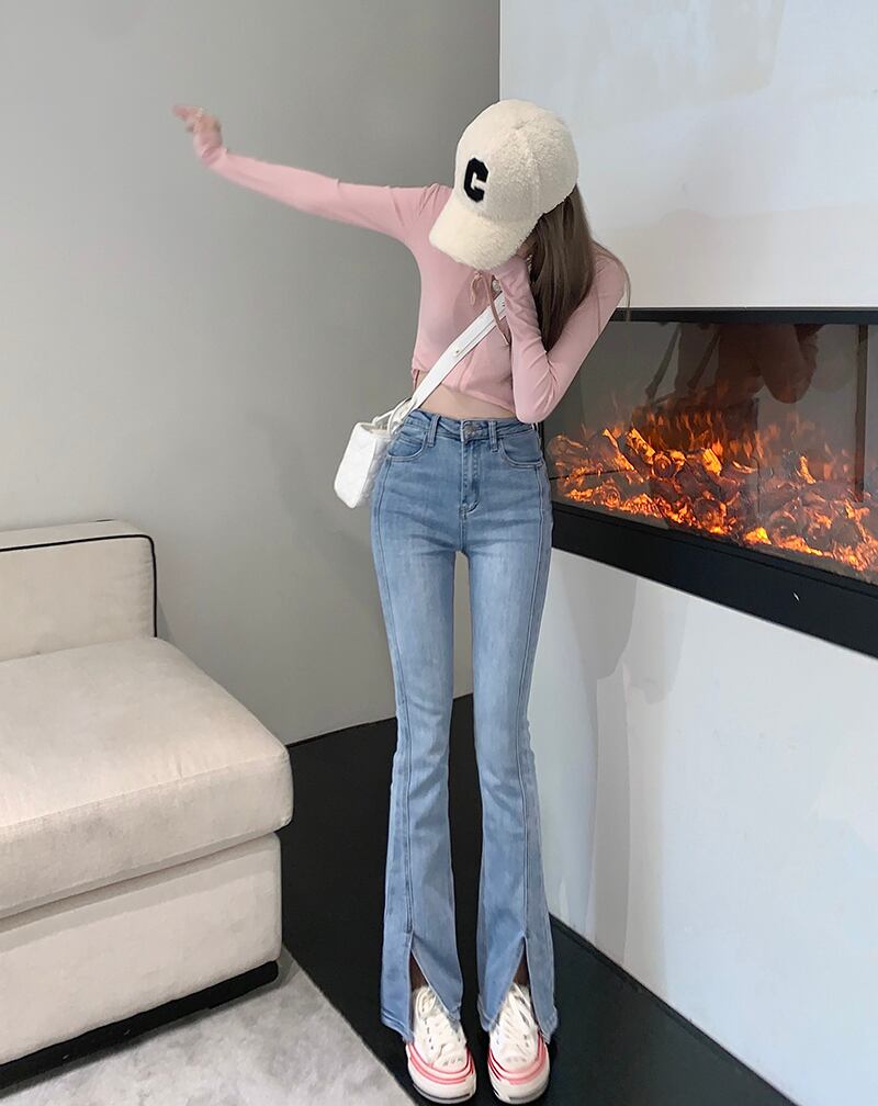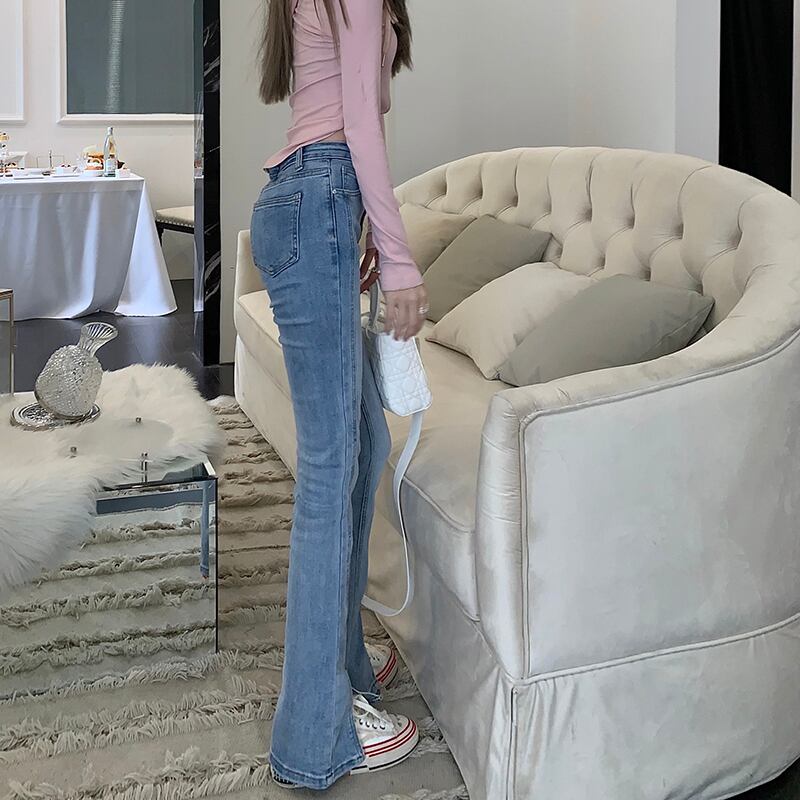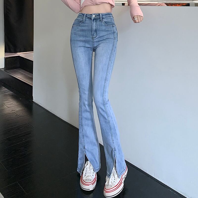 ライトブルーの伸縮性スリットジーンズレディース2022年夏の新しいドレープパンツハイウエストスリミングマイクロフレアパンツ ハイウェスト レッド エラスティック サマー 夏物 bstraw5233609383 | beaute25