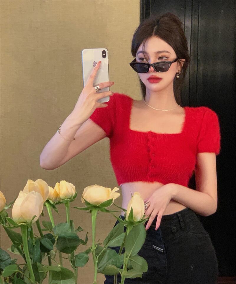 ホットスリム半袖ニットカーディガン女性の夏の薄いセクション純粋な欲望風スクエアカラーは薄いショートトップボトミングシャツを示しています サマー 夏物 ピュア スクウェア bstraw4059164504 | beaute25