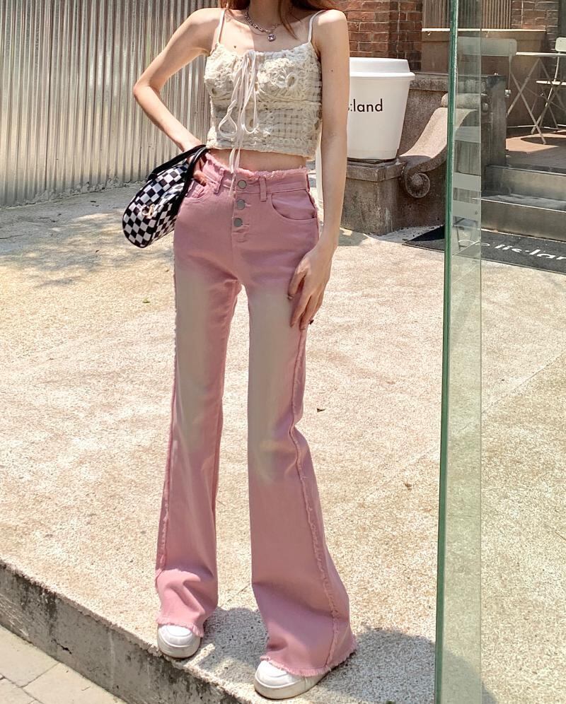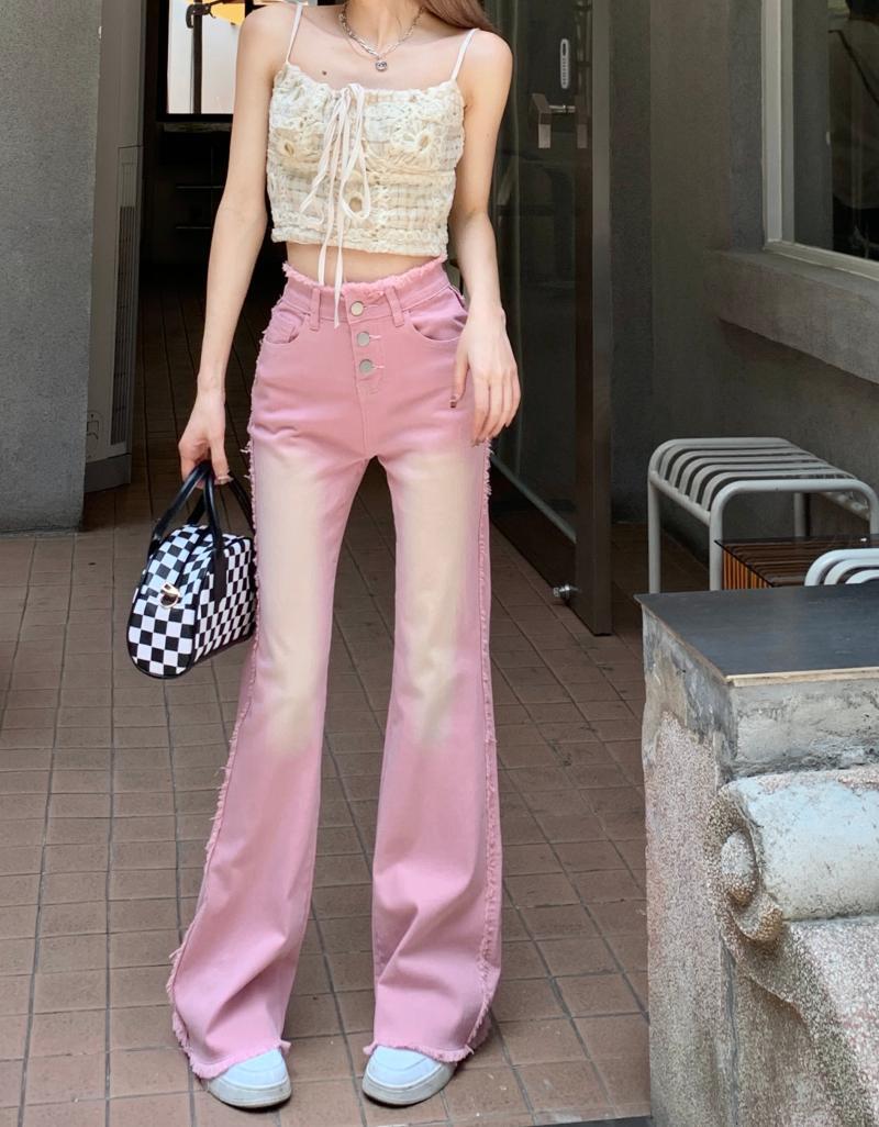 ピンクの生のエッジスリムジーンズ女性の夏の薄いセクション小さなオールマッチハイウエストスリムマイクロフレアパンツパンツ ハイウェスト レッド サマー 夏物 bstraw88399915769 | beaute25