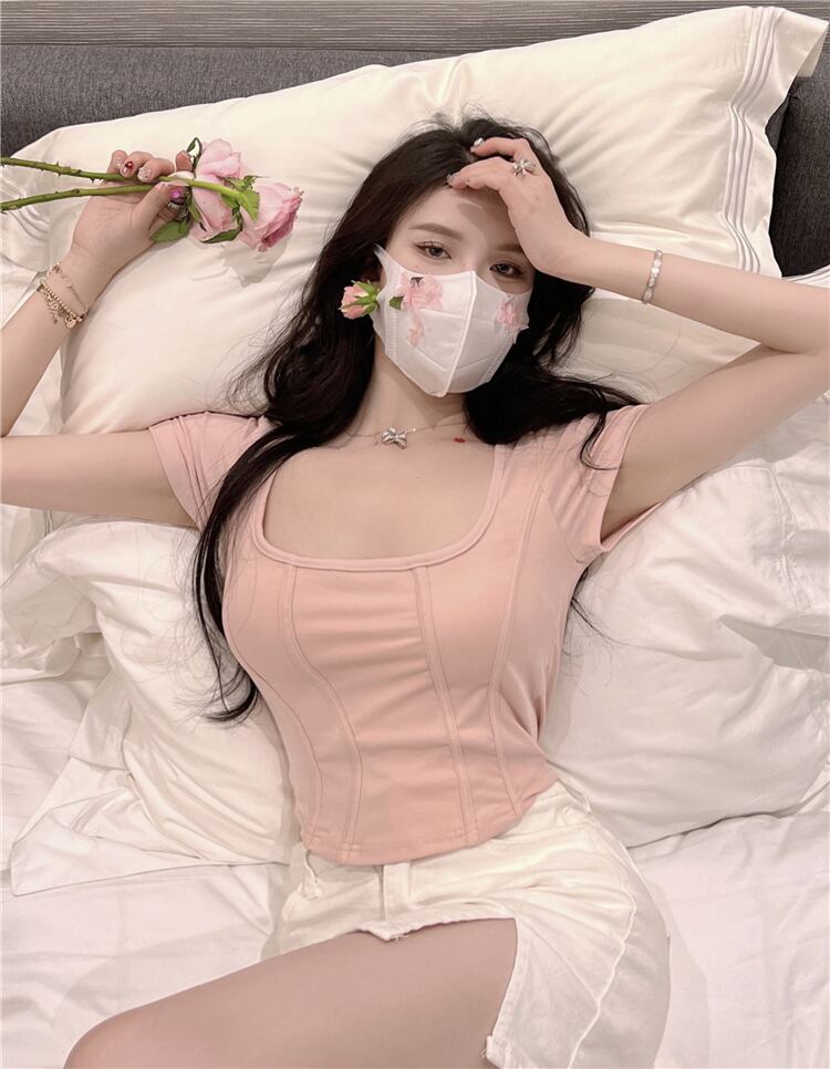 純粋な欲望Tシャツ女性ins潮夏ピンク甘くてスパイシーなスクエアカラーセクシーなタイトフィットフィッシュボーンデザインニッチ半袖トップ 大人ガーリー スウィート キュート カジュアル サマー 夏物 スクウェア bstraw240679566 | beaute25