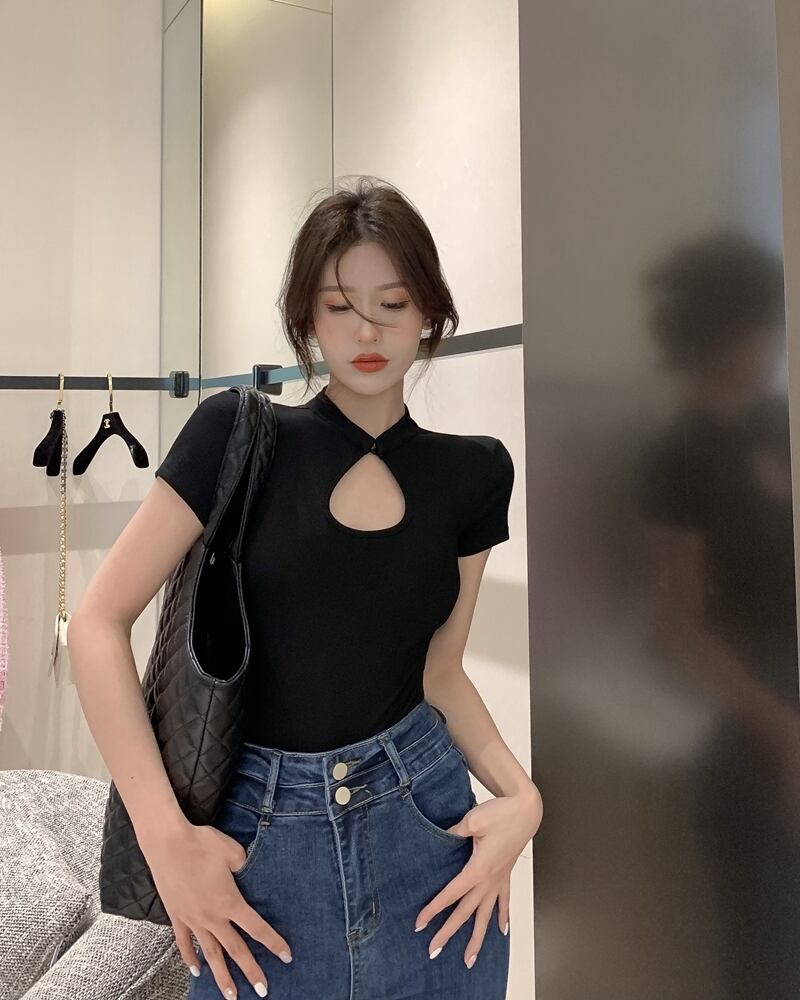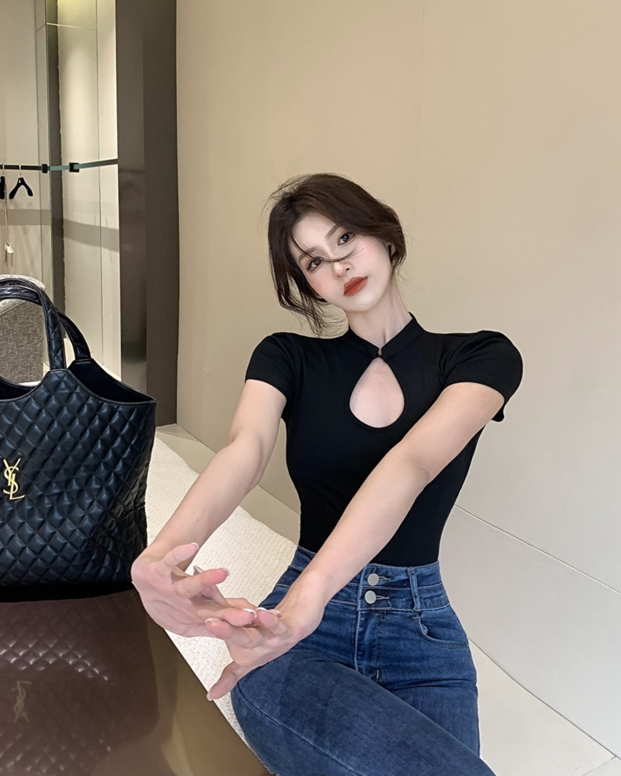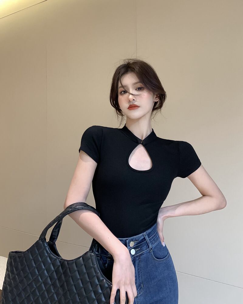 黒の半袖Tシャツレディースインサマーショートスタイル、シック、スリム、スリムなデザイン、ニッチトップ、ボトミングシャツ、トレンディ ブラック 夏物 bstraw80246950295 | beaute25