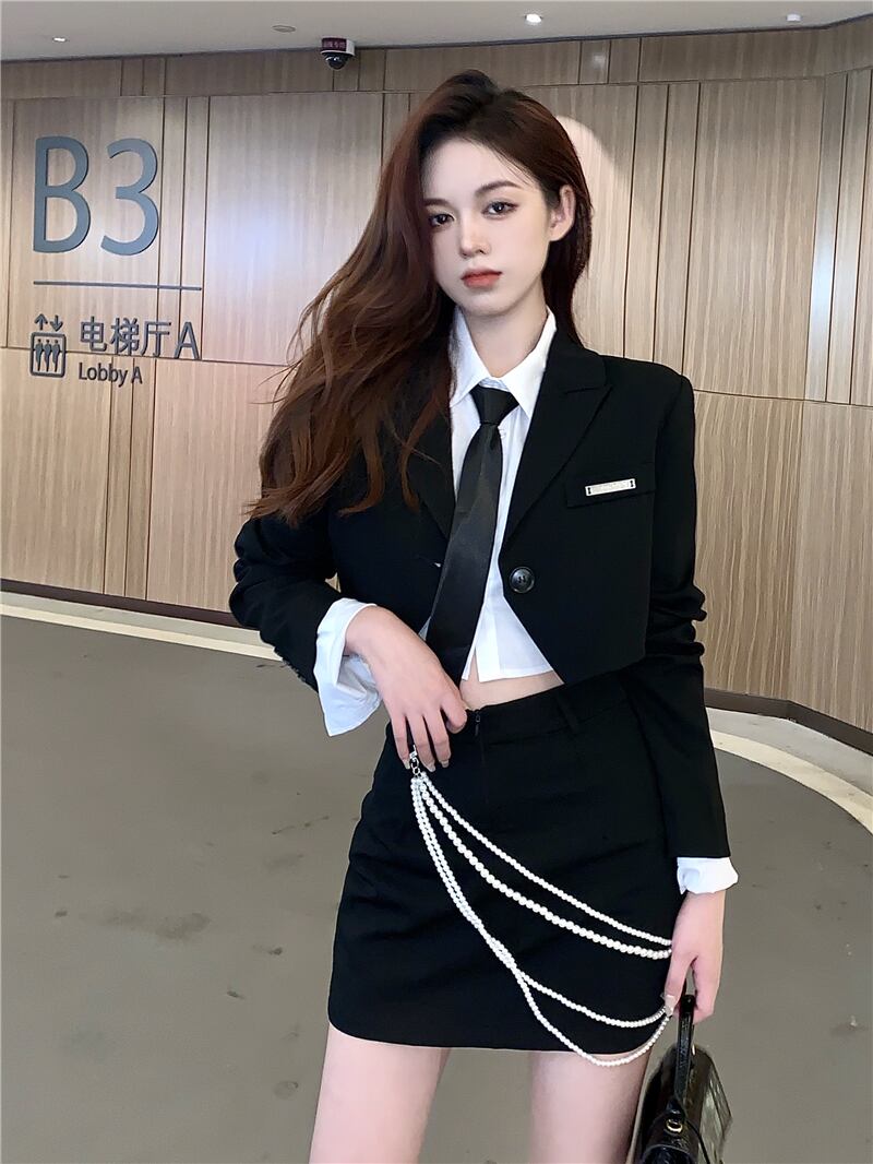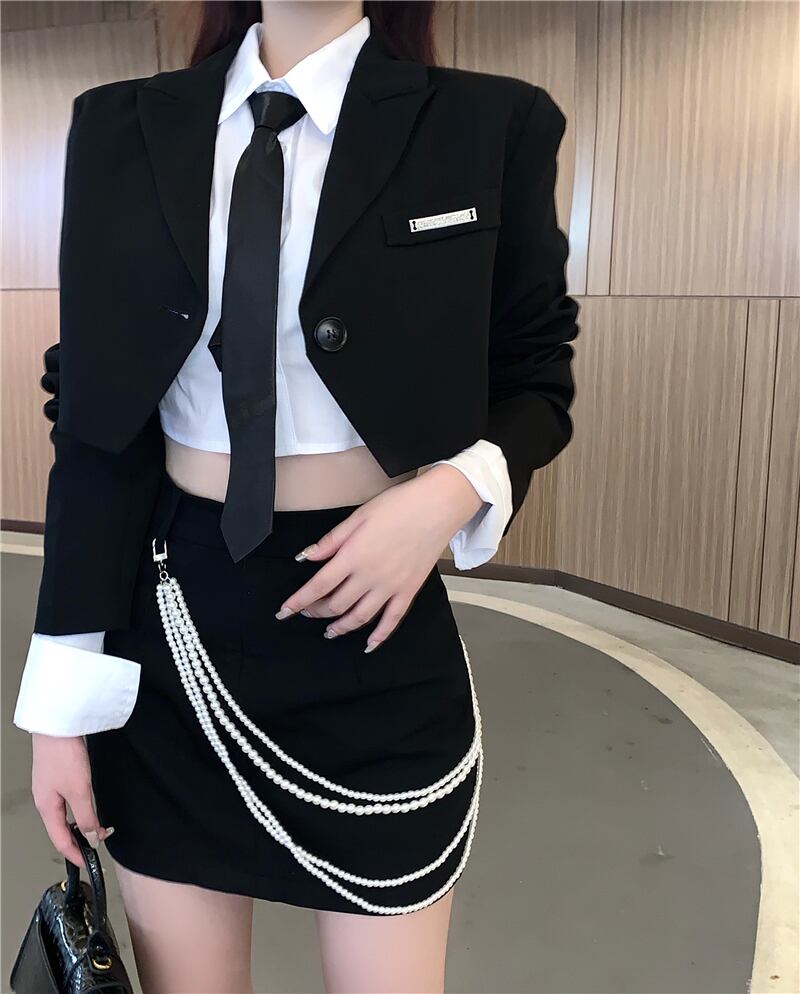 色:ネクタイと白いシャツ,パールチェーン付きスカート,黒いスーツ
