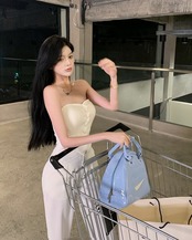 色:白いチューブトップ,ホワイトワイドレッグパンツ