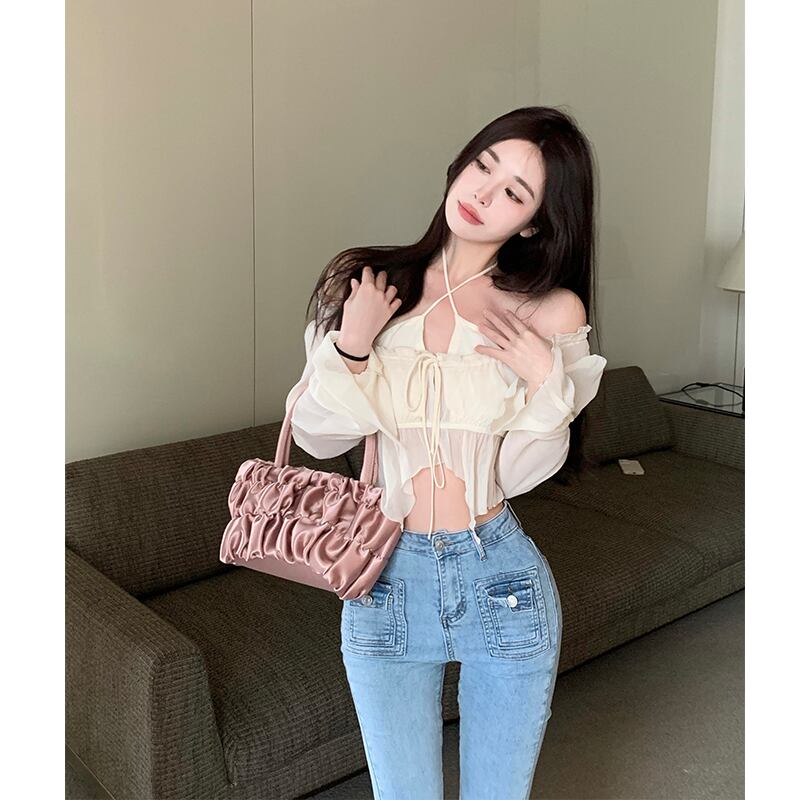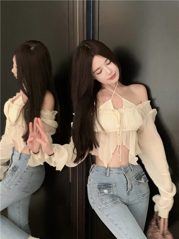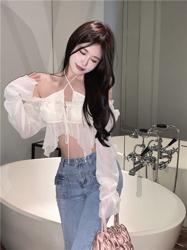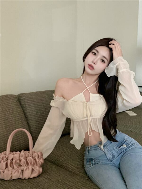 ワンショルダーピュアデザイアホルターネックシフォンシャツレディースデザインニッチフレンチシックスウィートでスパイシーなスリム長袖ショートトップ ロング 大人ガーリー キュート カジュアル bstraw93403994703 | beaute25