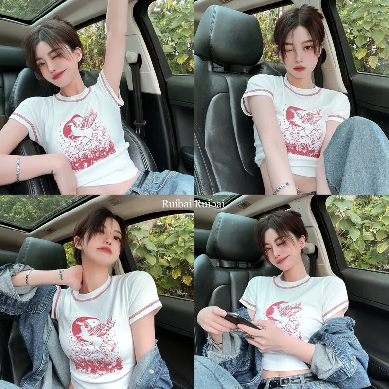 ホワイトグラフィティプリント半袖Tシャツレディース2022夏新作アメリカンレトロショートラウンドネックスリムトップイン サマー 夏物 Oネック bstraw60611875199 | beaute25