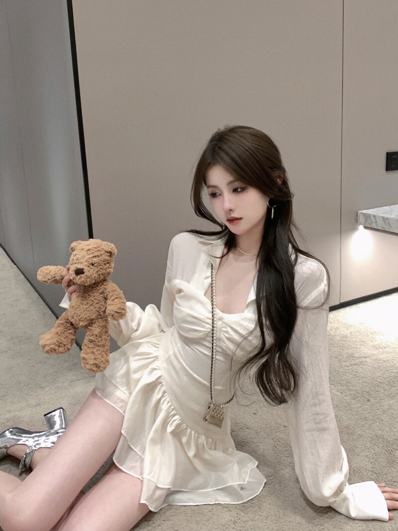 甘いスパイスガール長袖シャツドレス夏の純粋な欲望白い四角い襟折りたたまれたウエスト薄いふくらんでいる短いスカート ショート ロング ホワイト 大人ガーリー スウィート キュート カジュアル サマー 夏物 ピュア スクウェア bstraw82933324086 | beaute25