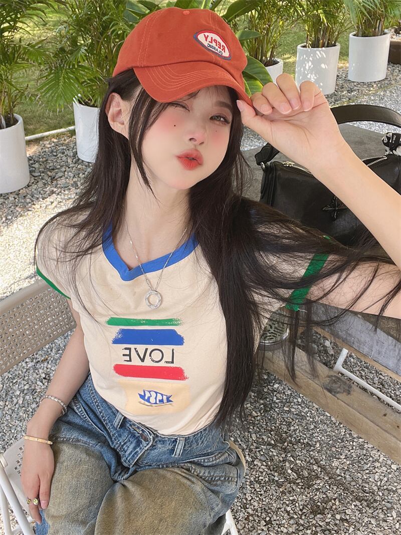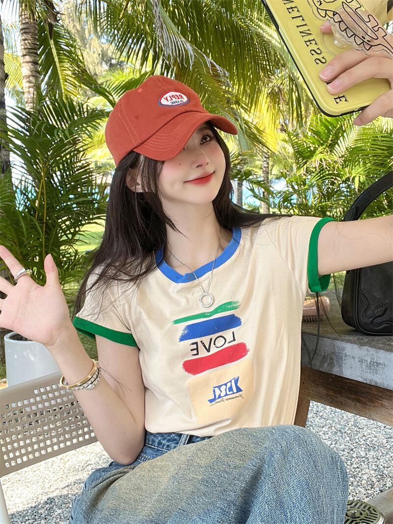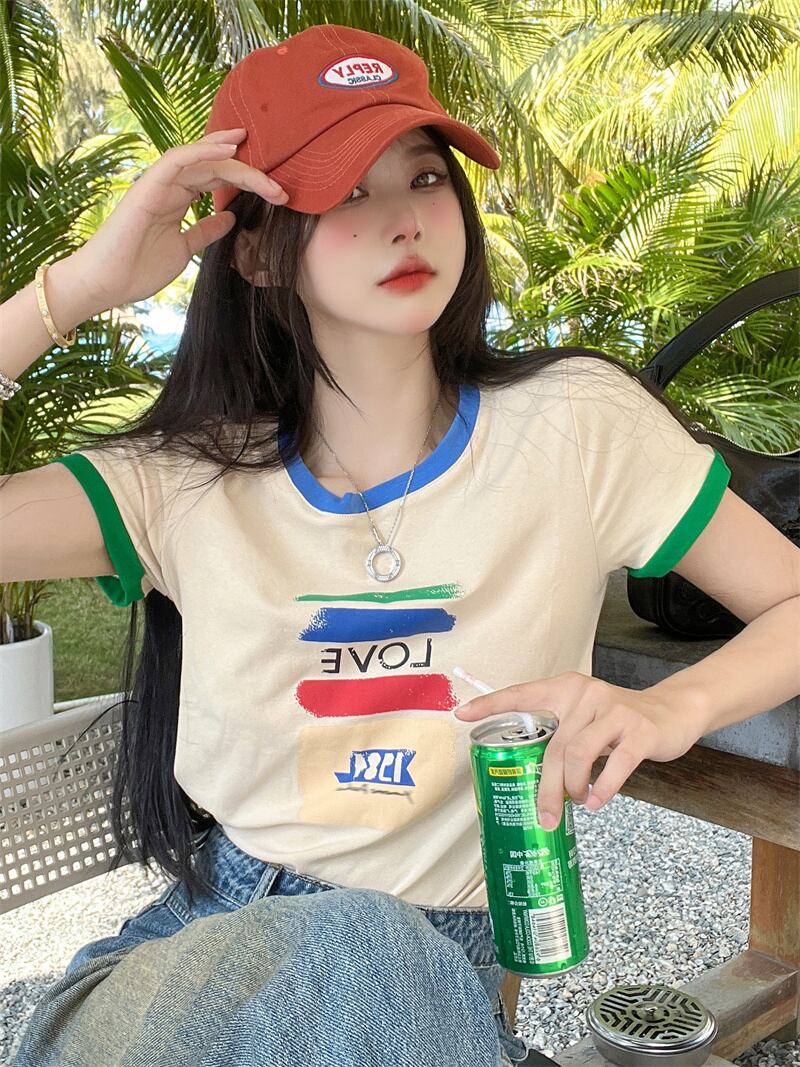 ホット半袖Tシャツ女性の2022年夏の新しいコントラストカラーフロントショルダーレタープリントスリムフィット薄いトップインタイド サマー 夏物 bstraw83138657035 | beaute25