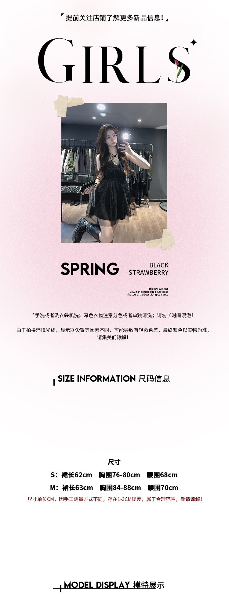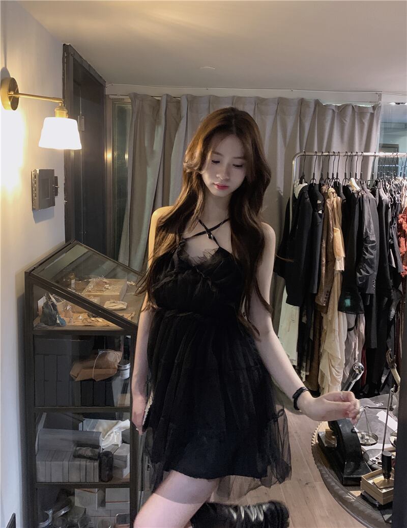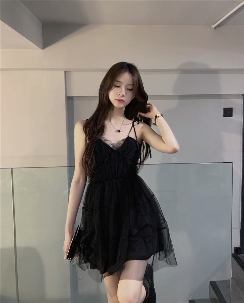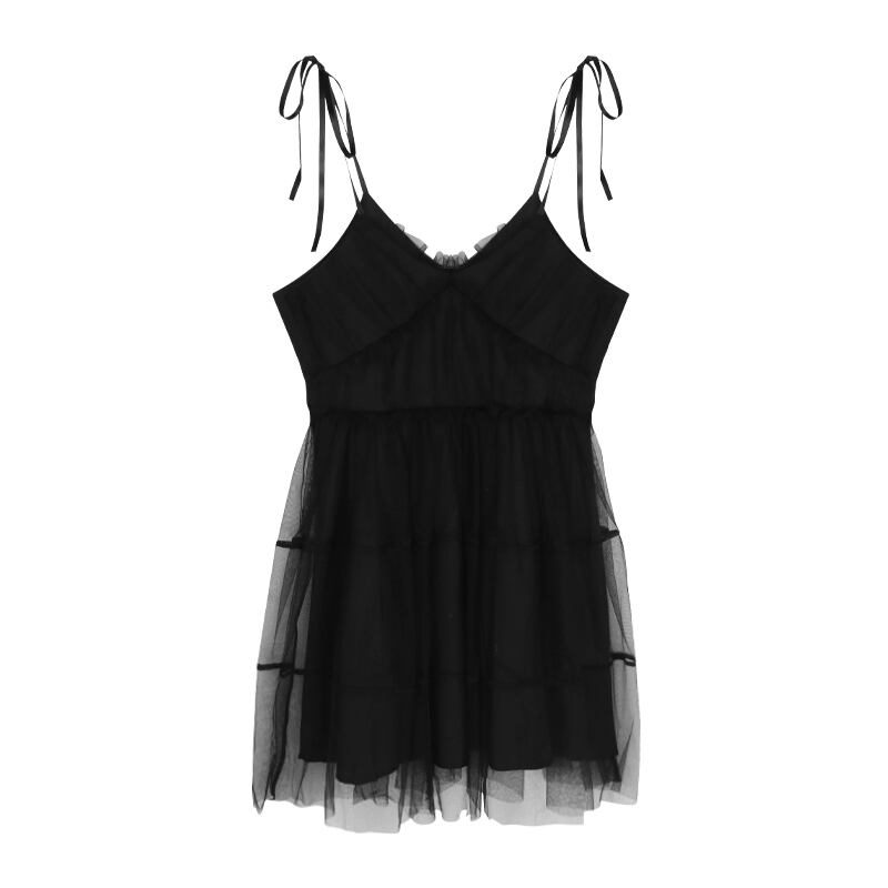 ブラックメッシュのVネックサスペンダードレス女性の2022年夏の新しい純粋な欲求はウエストを縮め、薄いふくらんでいる短いスカートを見せます ショート サマー 夏物 ピュア bstraw38114497701 | beaute25