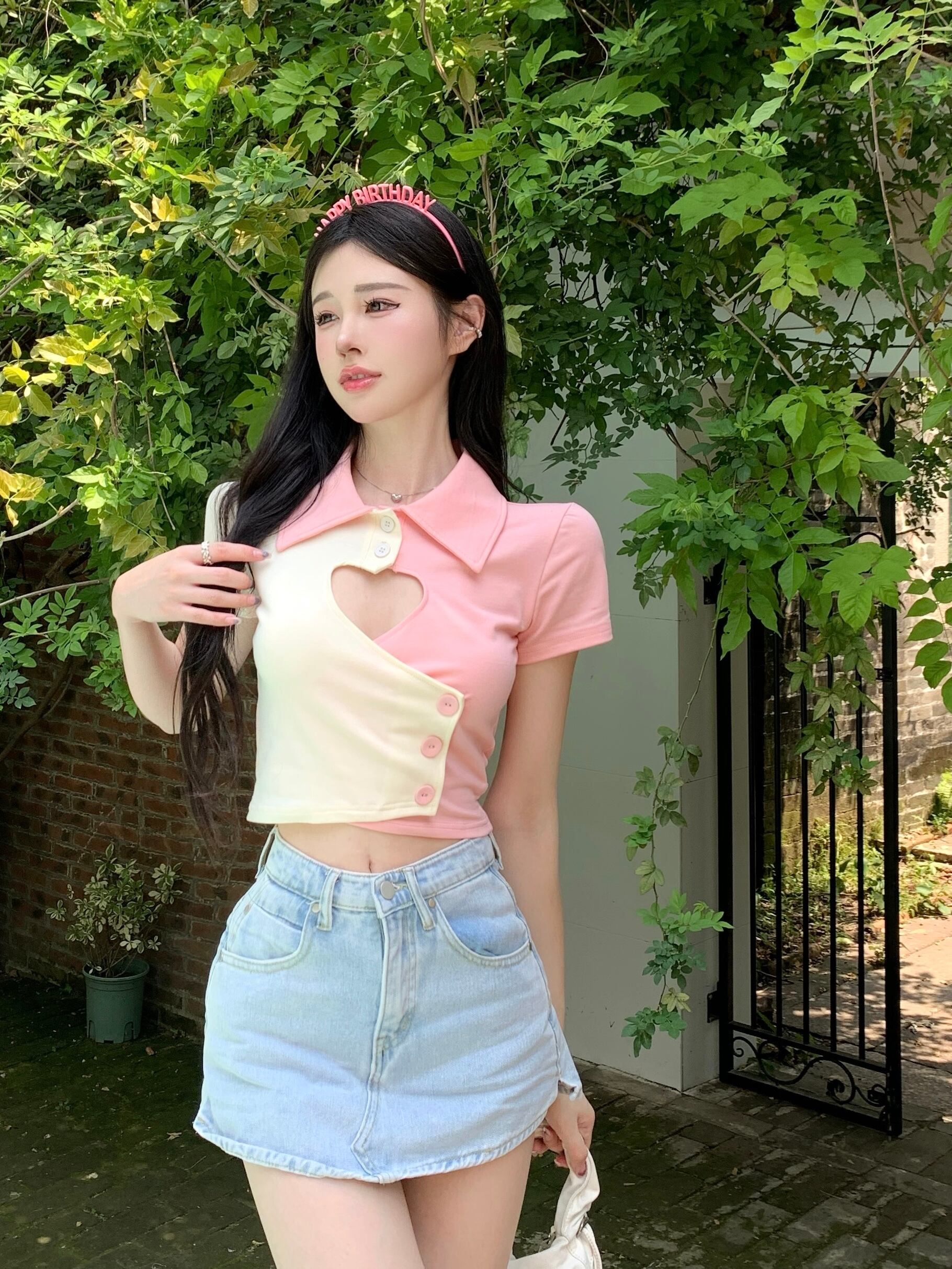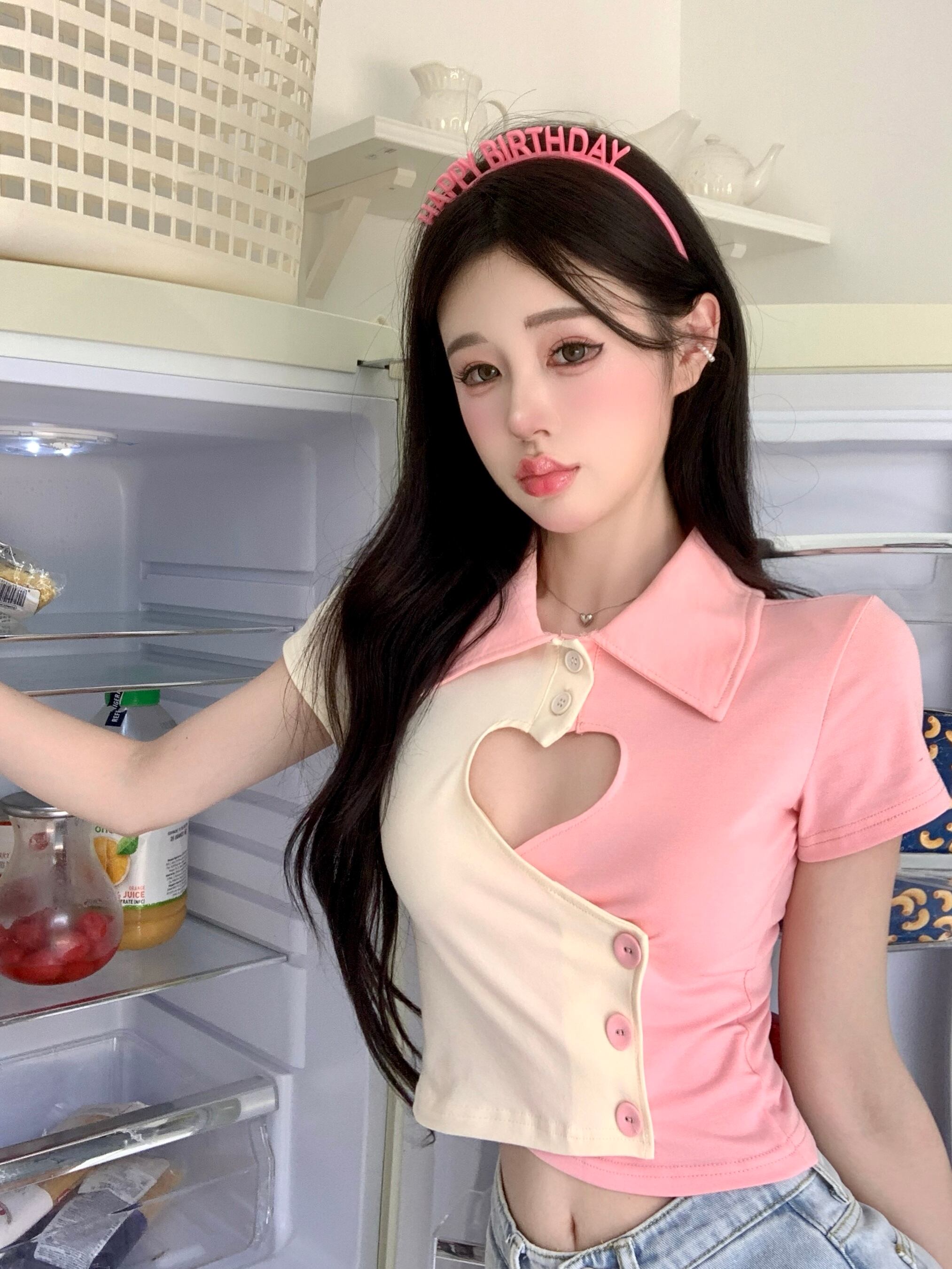 スウィートスパイスガールホロウ半袖Tシャツレディースサマーショートポロカラーシックスリムフィットスリムスモールトップ ハーフスリーブ 大人ガーリー キュート カジュアル 夏物 bstraw45249467792 | beaute25