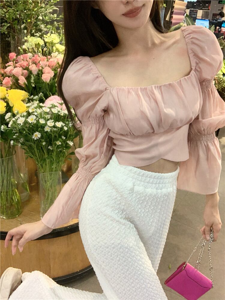 フレンチスクエアネックシャツレディースセンセーションニッチボウショートプリーツスリムロングスリーブシャツサマートップ リボン 長袖 夏物 スクウェア bstraw17920175683 | beaute25