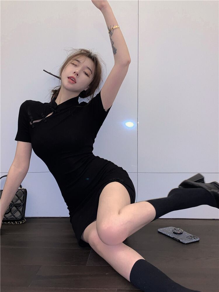 黒の改良されたチャイナドレス半袖ドレス女性の夏の純粋な欲望スタイルセクシーなウエストスリムシックなバッグヒップショートスカート ブラック サマー 夏物 ピュア bstraw95871961169 | beaute25
