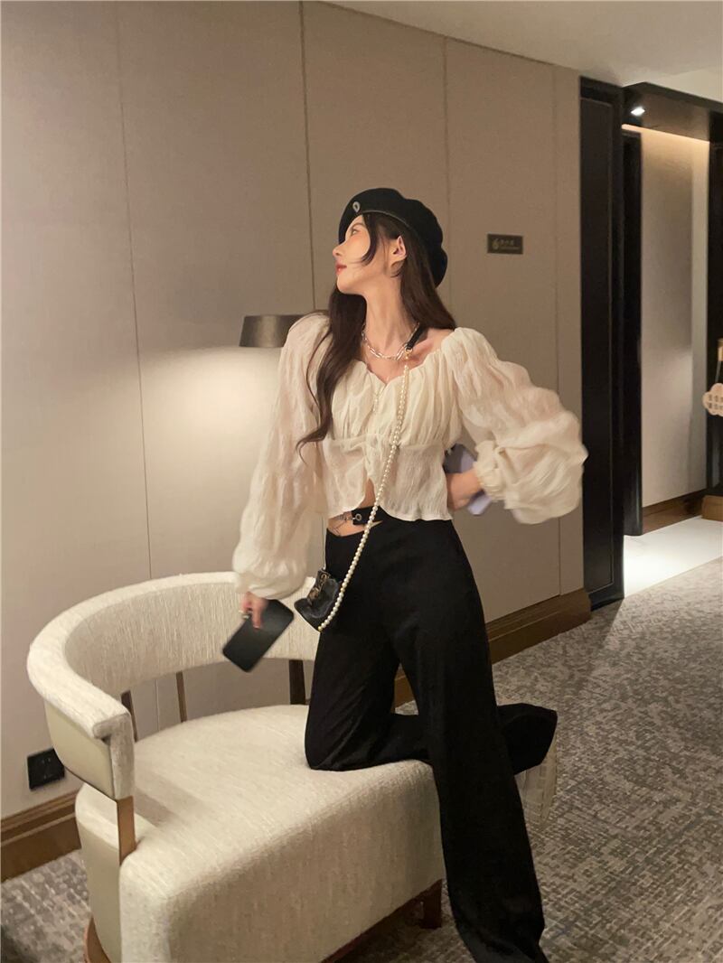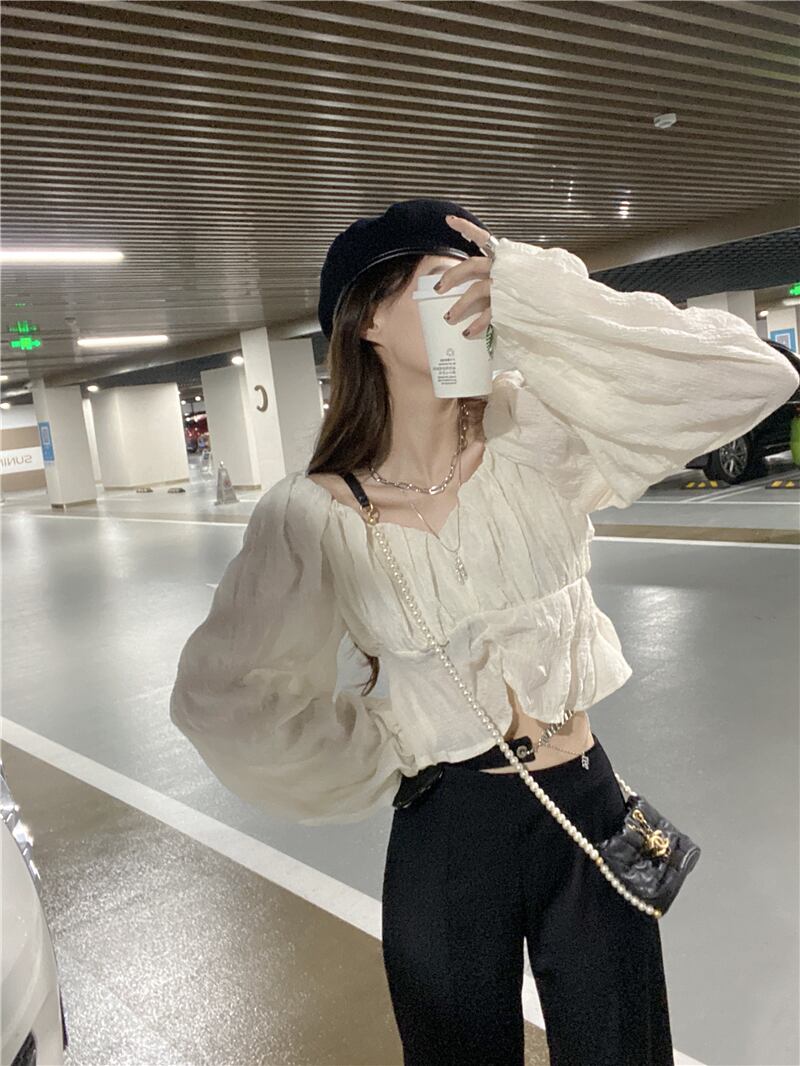 フレンチスクエアネックプリーツシャツレディースサマーデザインニッチショートスタイルシックシャツスリム気質長袖トップス ロング 夏物 スクウェア bstraw93448647301 | beaute25