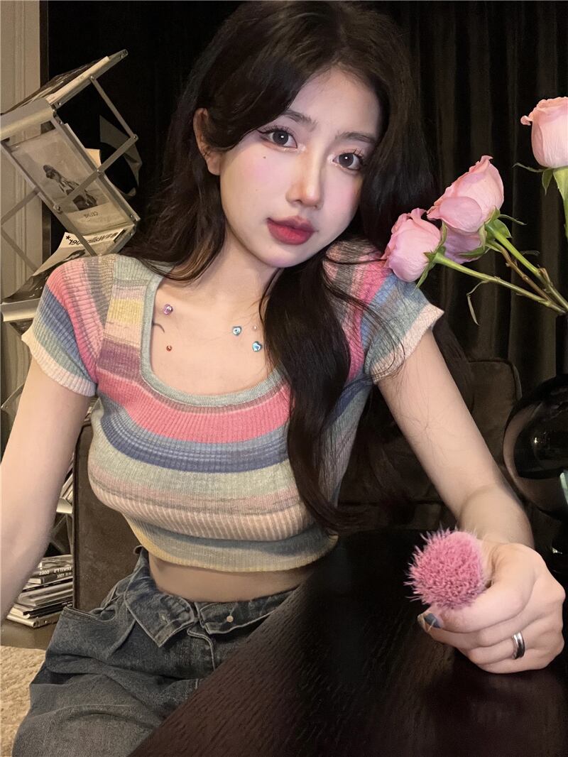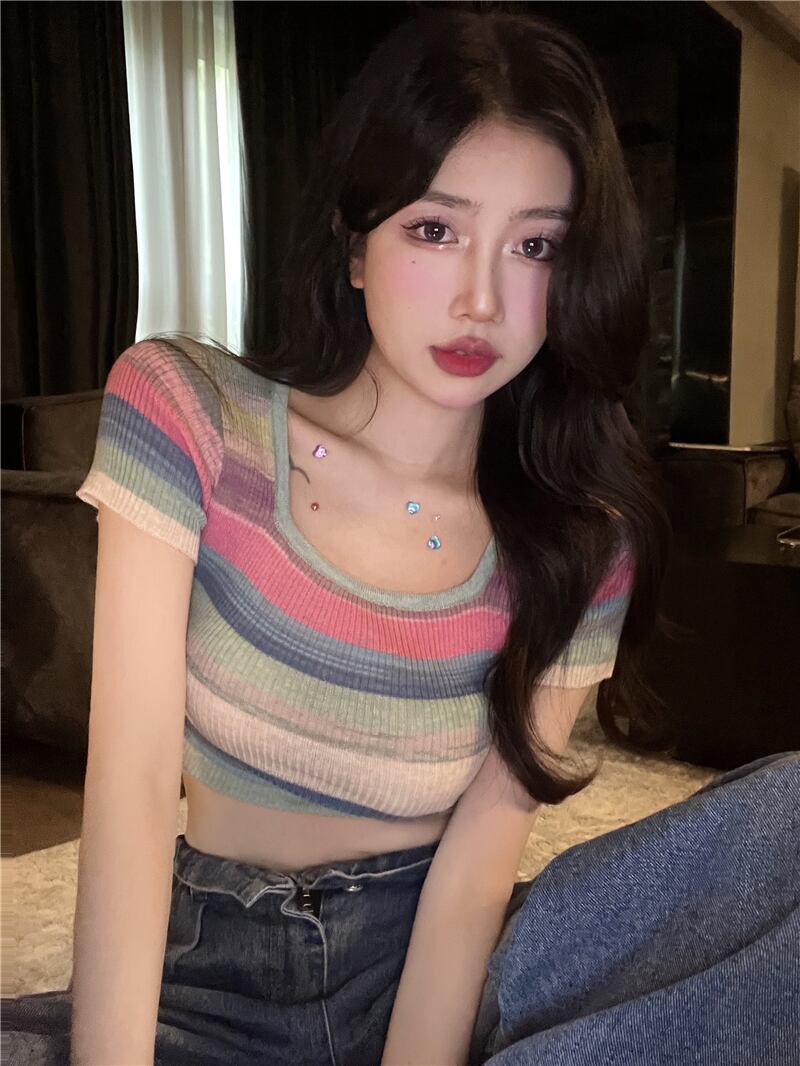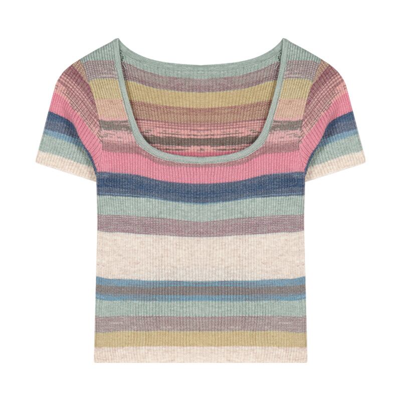 コントラストカラーの絞り染めストライプ半袖セーターレディースサマーショートスクエアネックプルオーバータイトフィットシントップボトミングシャツ 夏物 スクウェア bstraw1180713276 | beaute25