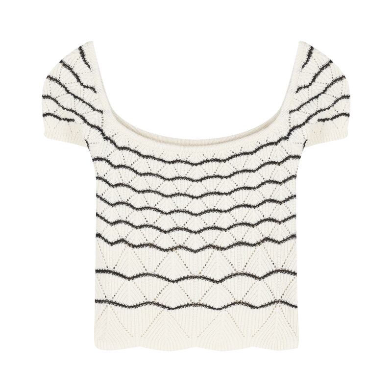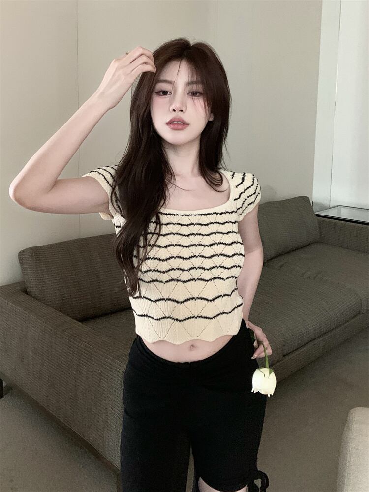 スクエアネックストライプ半袖ニットTシャツレディースサマーショートイントレンディなスリムフィットと薄手のインナートップボトミングシャツ 夏物 スクウェア bstraw70068900717 | beaute25