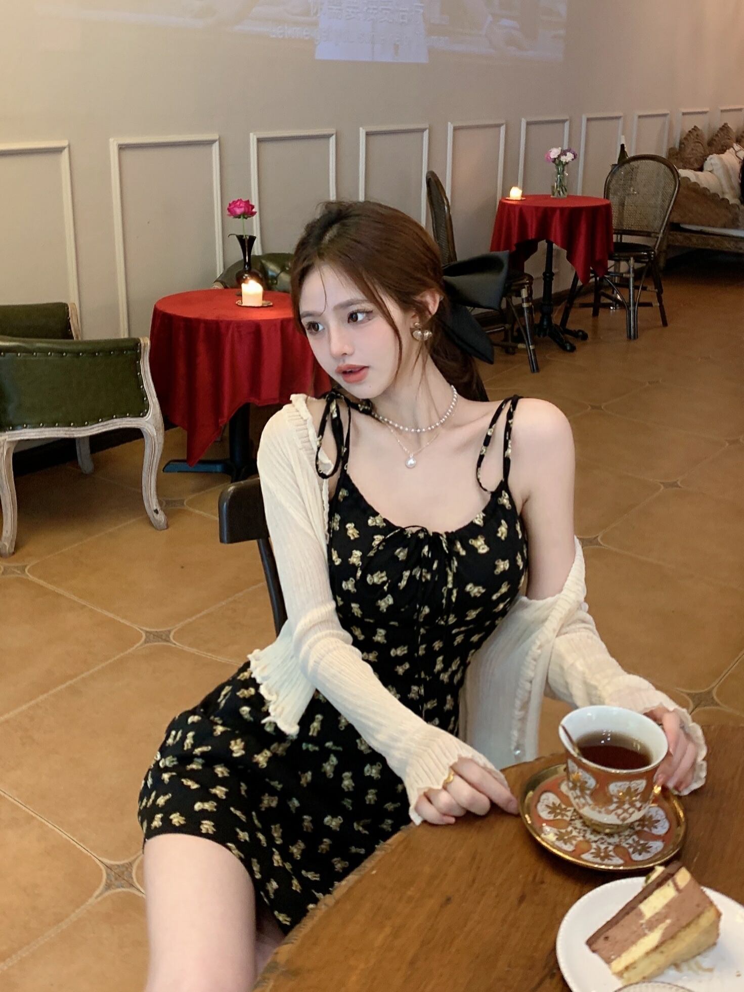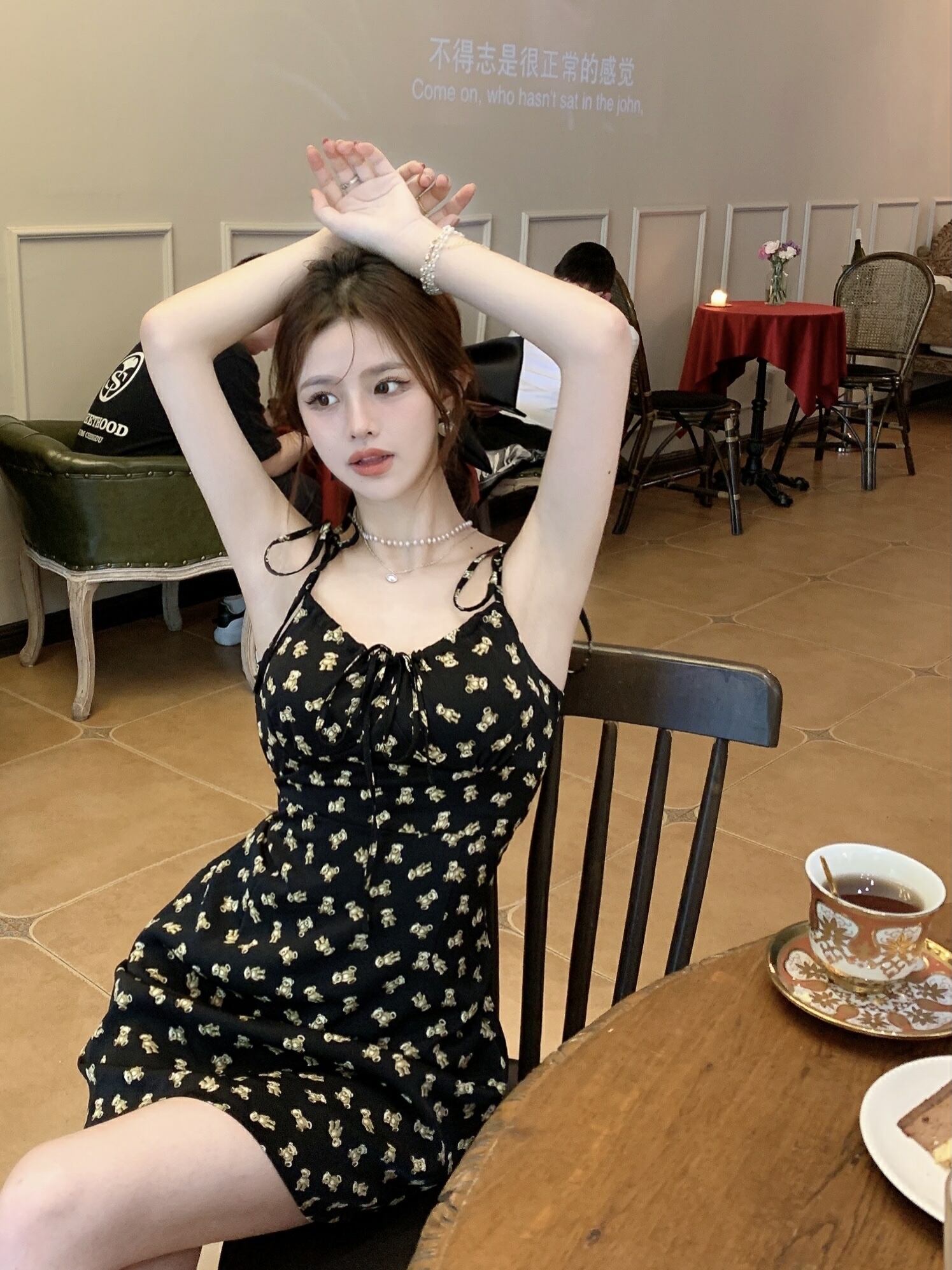 フランスの花のスリングドレス夏の甘いスパイスの女の子は薄い背中の開いたVネックウエストレスノースリーブバッグヒップショートスカートを示しています 大人ガーリー スウィート キュート カジュアル サマー 夏物 花柄 bstraw55825854071 | beaute25