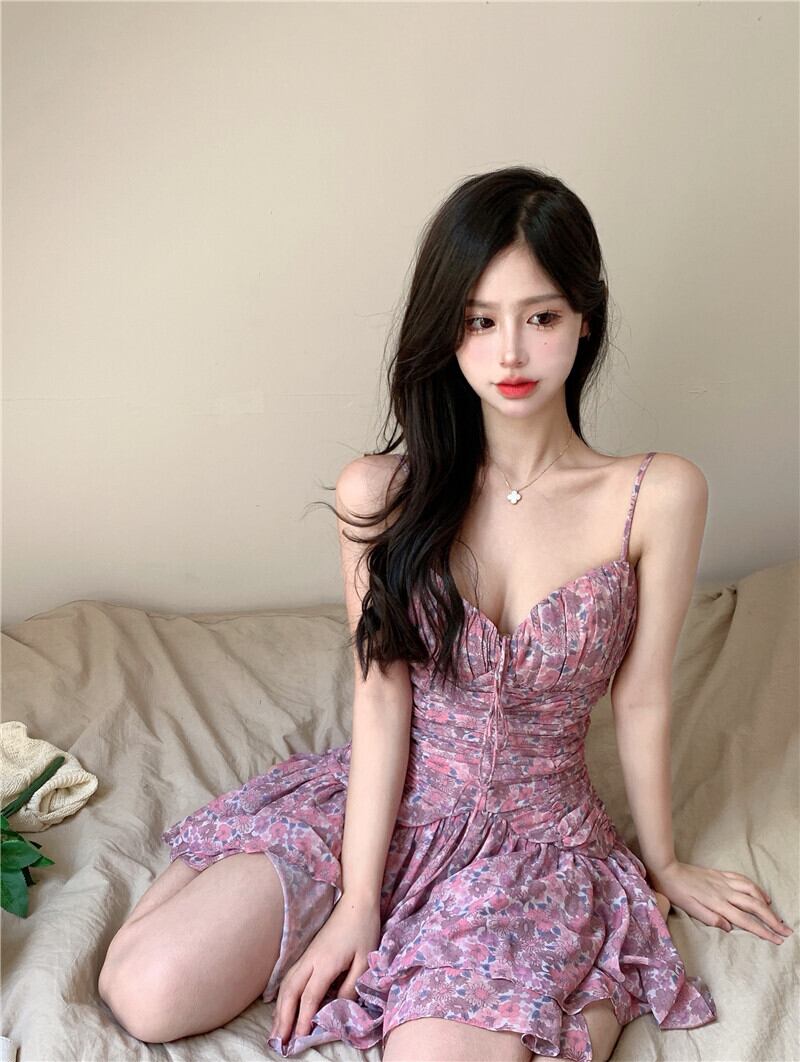 フランス語フローラルサスペンダードレス女性の夏の純粋な欲望セクシーな気質の言葉キキョウ科ウエスト初恋ショートスカート レース サマー 夏物 花柄 ピュア bstraw46361734468 | beaute25