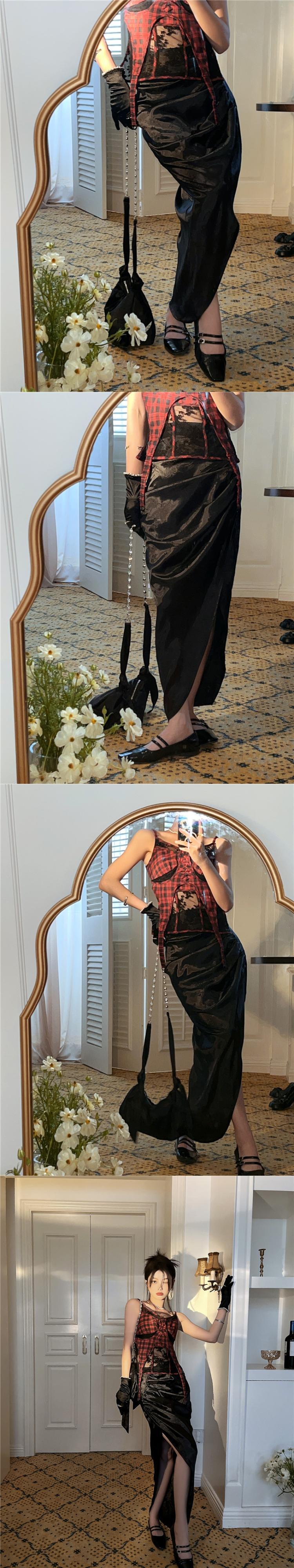 色:白いショール,ホワイトサテンストラップ,赤い格子縞のスリング,白いスカート,黒スカート