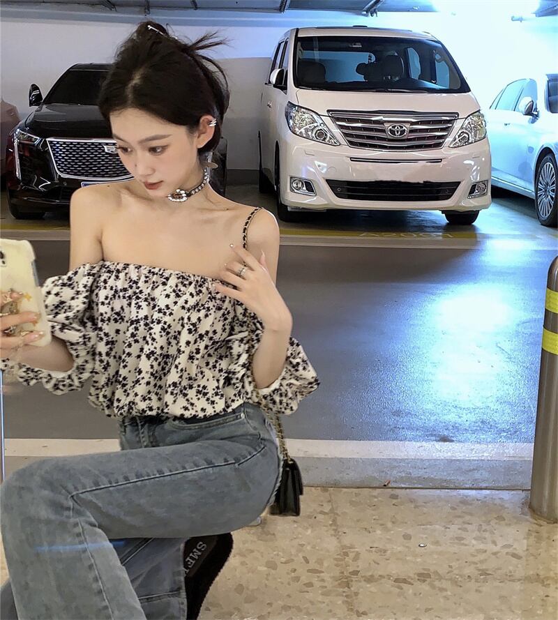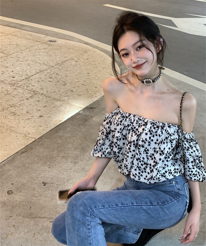 フレンチフローラルワンショルダーシャツレディースサマースウィートスパイスガールショートスモールスリムフィットスリムセクシートップ 大人ガーリー キュート カジュアル 夏物 花柄 bstraw65032304268 | beaute25