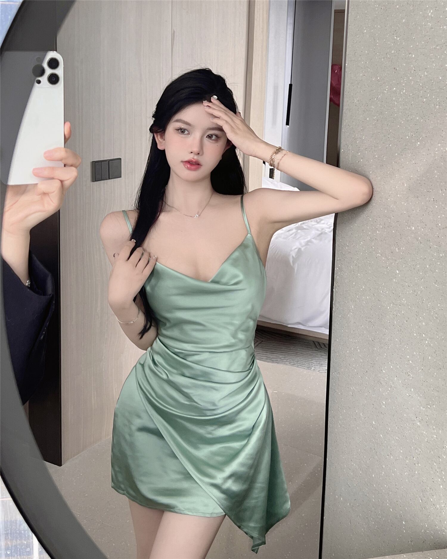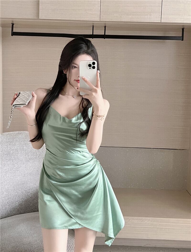イミテーションアセテートピュア欲望サスペンダードレス女性夏イレギュラーグリーンハイエンドセンスウエストセクシー気質ショートスカート サマー 夏物 bstraw25262858724 | beaute25