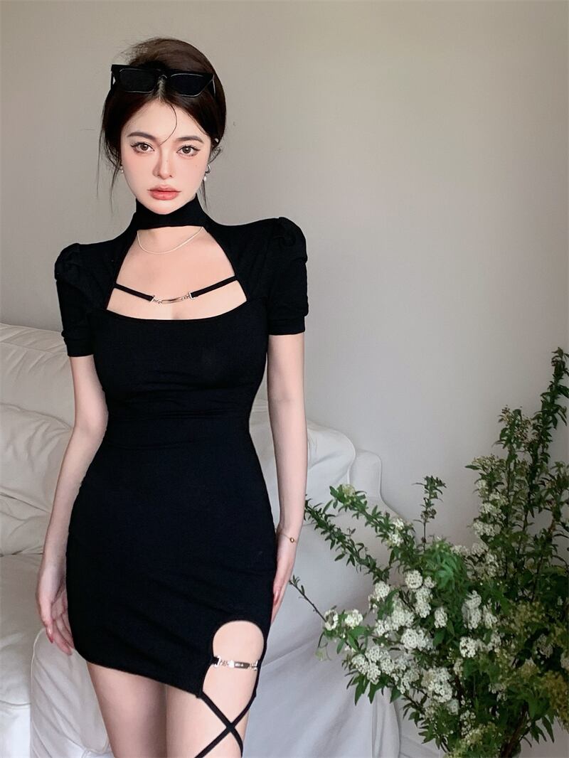 甘い女の子のセクシーな半袖ドレス女性の夏の黒の慎重なマシンストラップバッグヒップウエスト薄いスカート ブラック 大人ガーリー スウィート キュート カジュアル サマー 夏物 bstraw88114957313 | beaute25