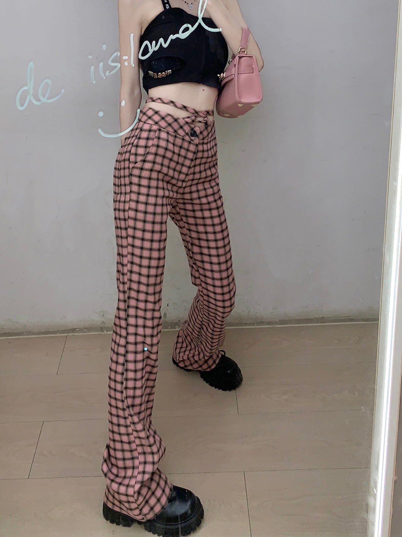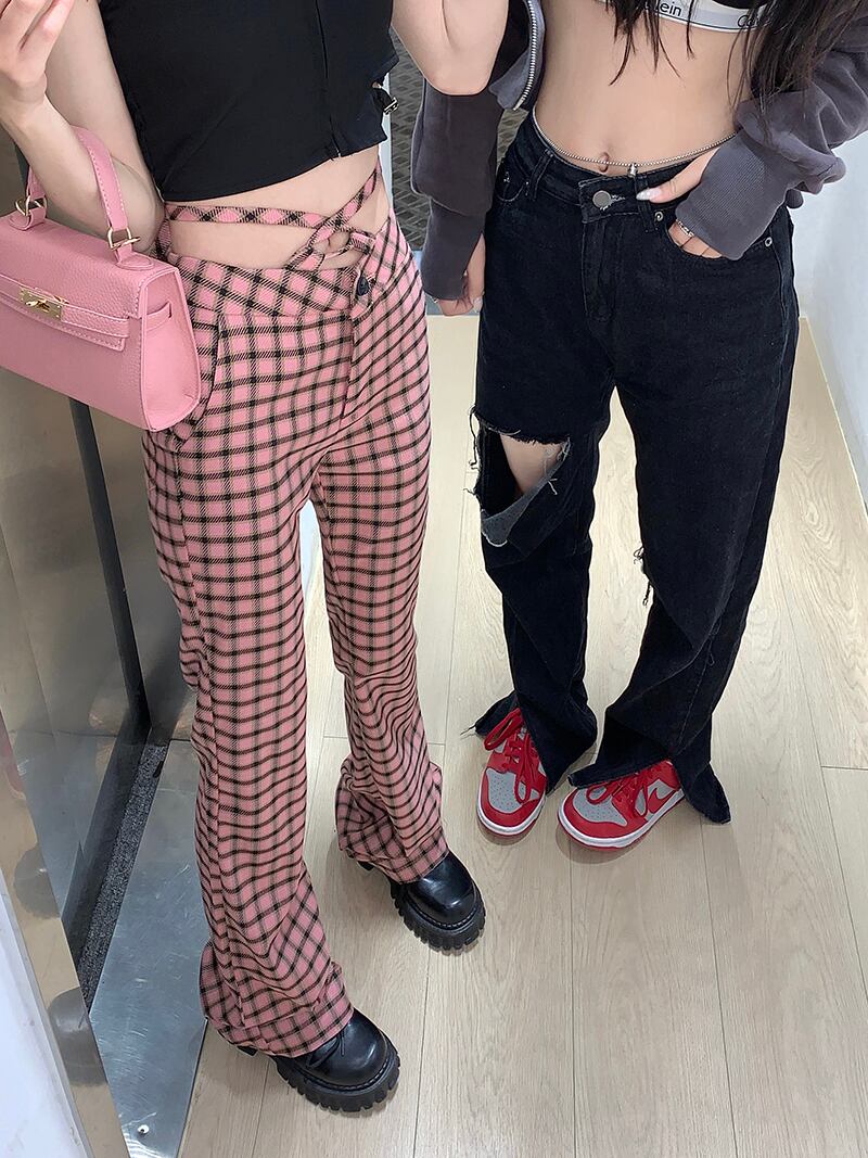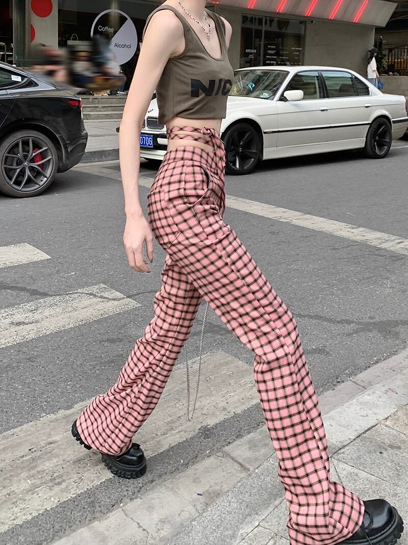 チェック柄レースアップカジュアルパンツレディースサマー薄切片ドレープオールマッチハイウエストショー薄足スリムワイドレッグパンツパンツ ハイウェスト 夏物 ワイドパンツ bstraw76514276673 | beaute25