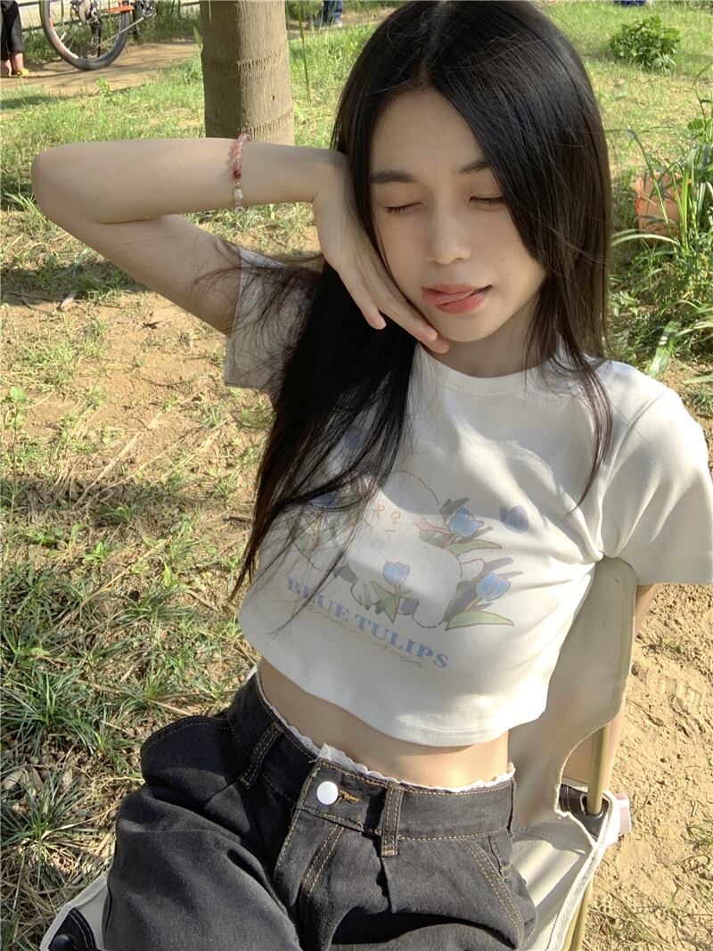 ホワイトプリントの半袖Tシャツレディースサマーピュアなスリムスモールスウィートショートシックシントップへの欲求 大人ガーリー キュート カジュアル 夏物 bstraw27967911905 | beaute25