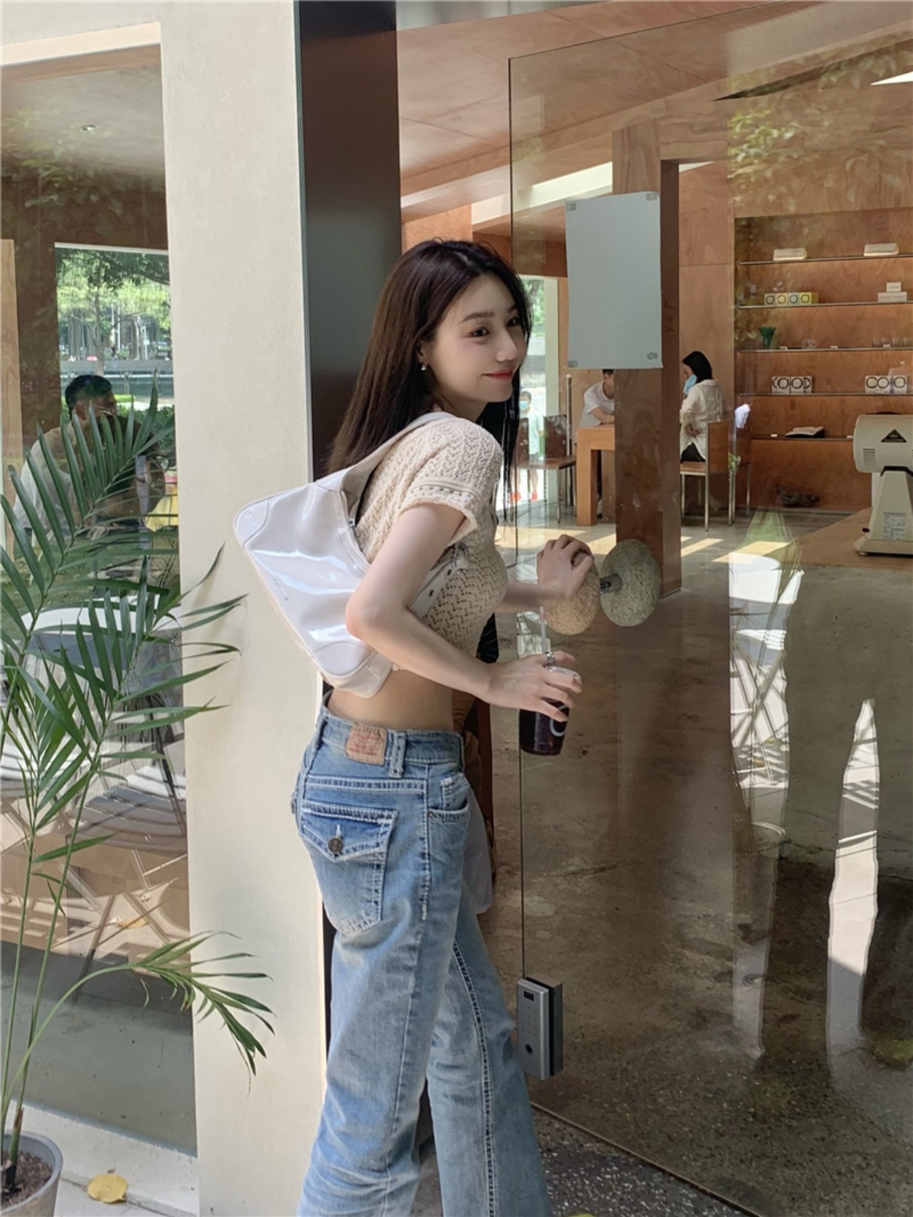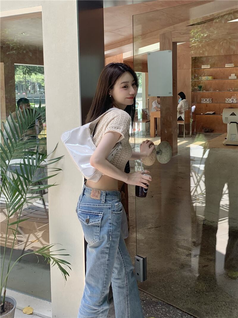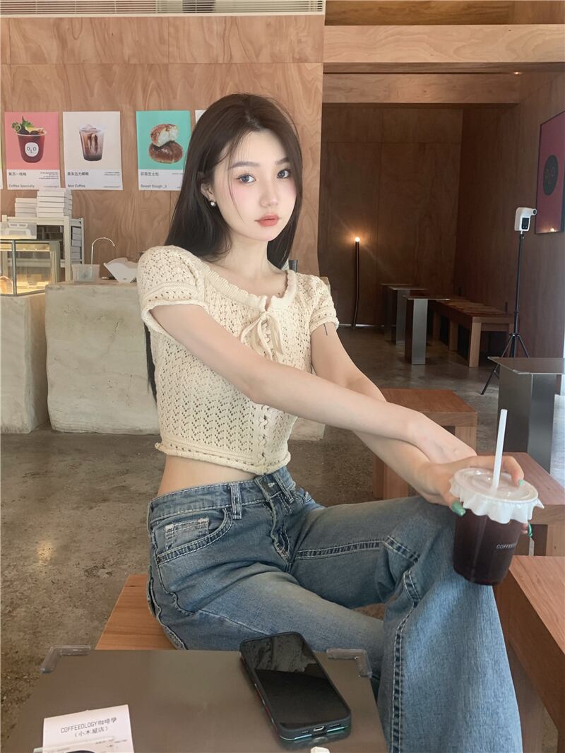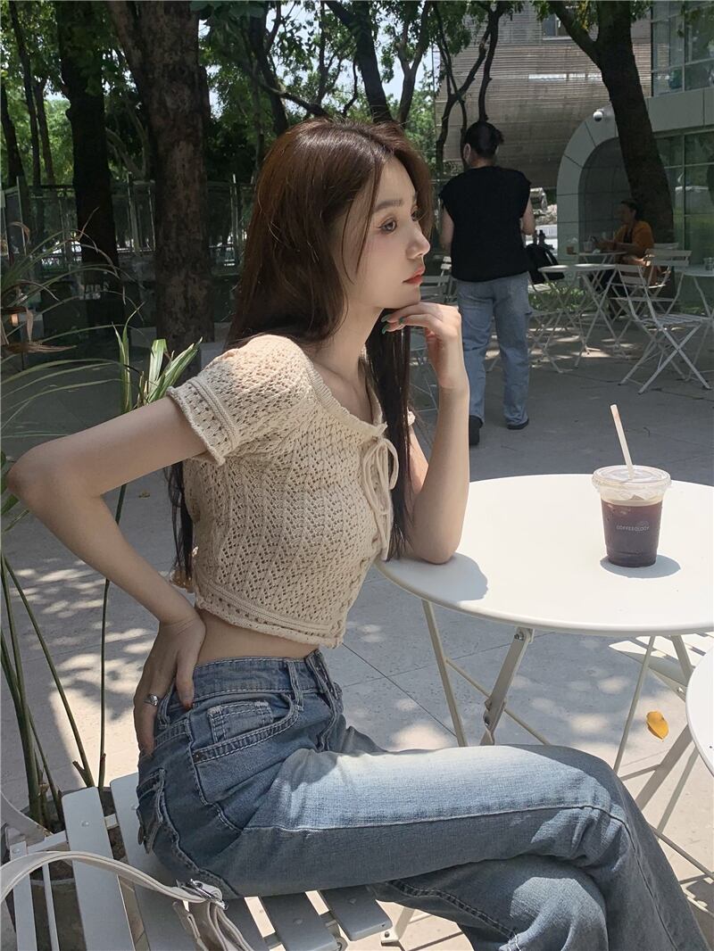 純粋な欲望風中空半袖セーター女性の夏の薄片甘い気質プルオーバーストラップショートトップトレンディ 大人ガーリー スウィート キュート カジュアル サマー 夏物 bstraw71652970009 | beaute25