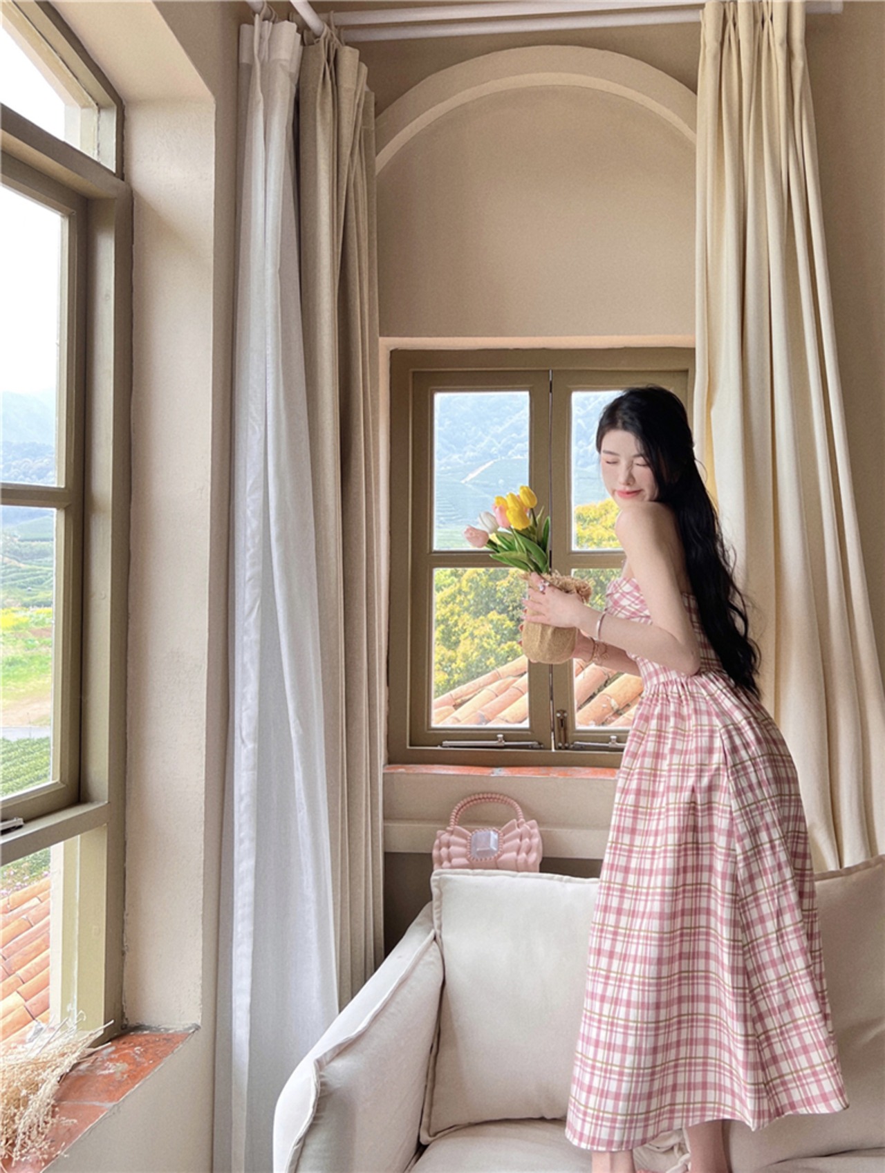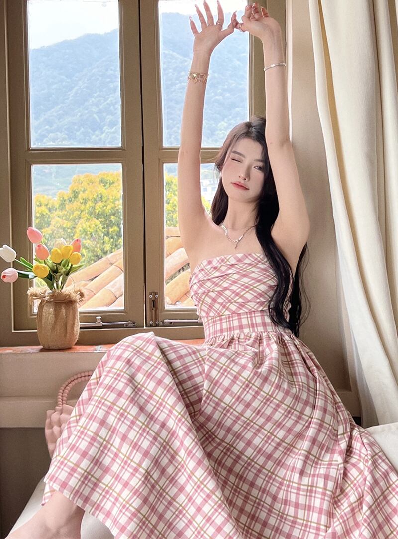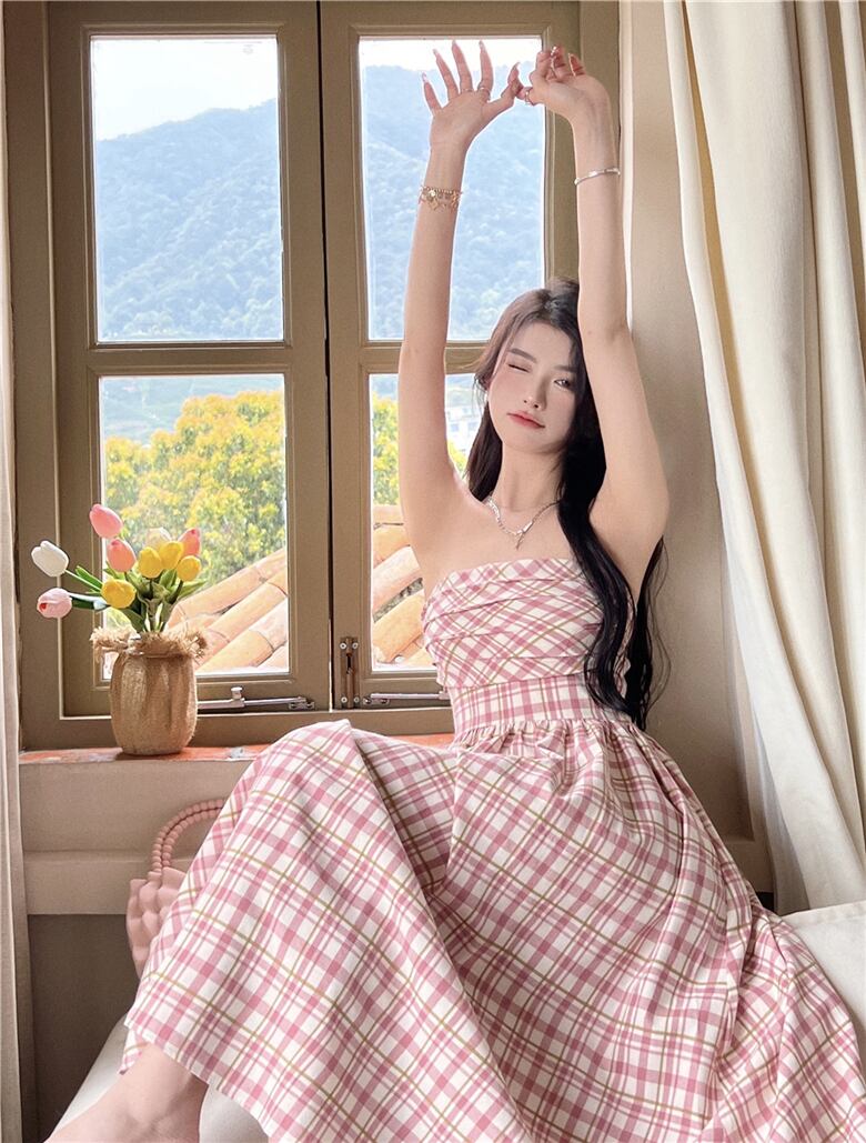 甘い格子縞のチューブトップドレス女性の夏のワンショルダーカジュアル気質ウエストスリミングロングプリンセススカート 大人ガーリー スウィート キュート サマー 夏物 bstraw81793161054 | beaute25