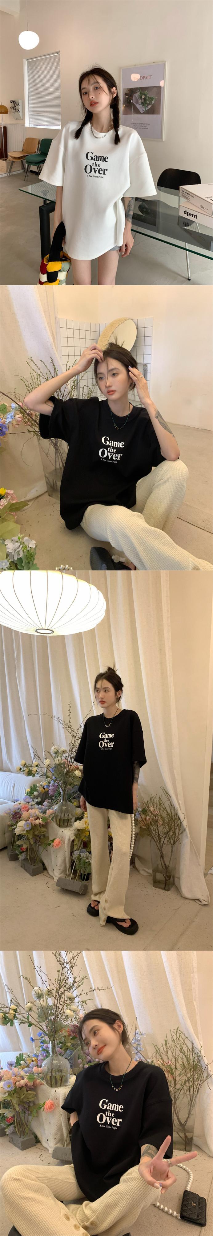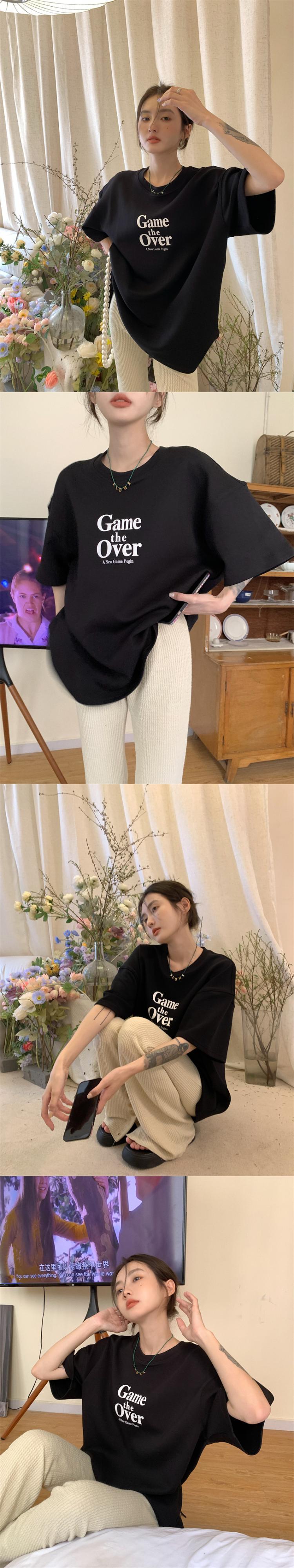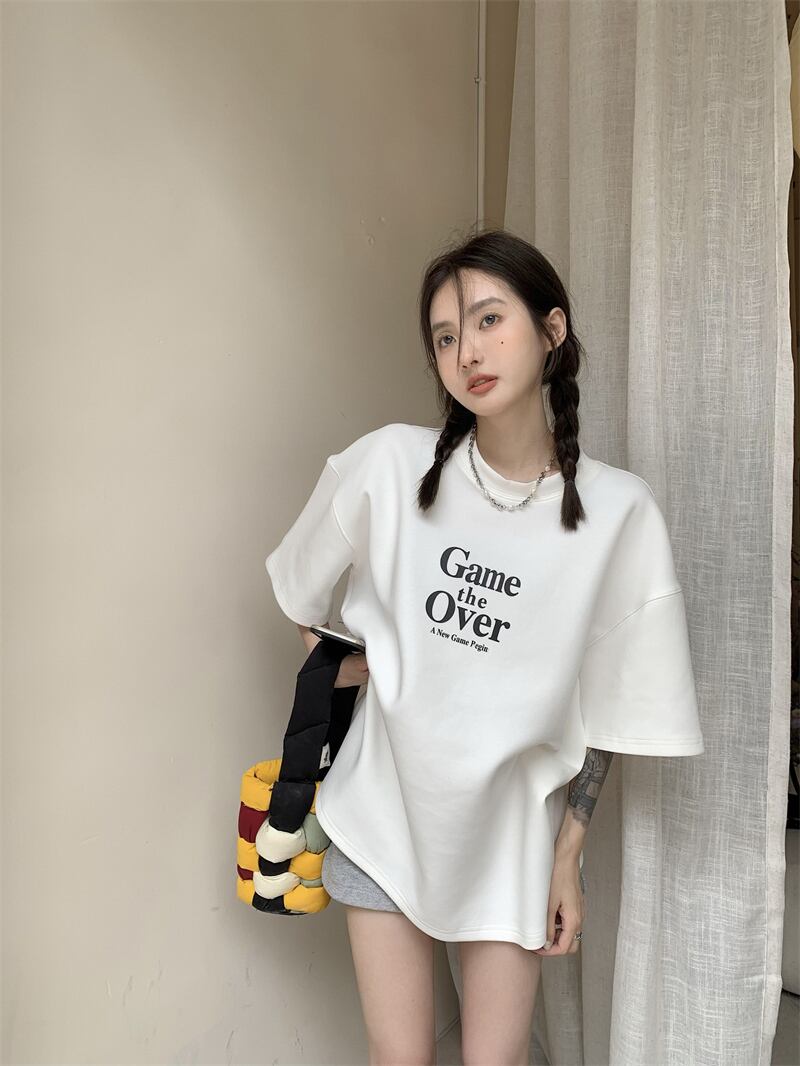 バージョンTシャツ女性イントレンディな夏の純綿薄手白ルーズプリントレターミドル丈フロントショルダー半袖トップス ホワイト コットン サマー 夏物 ピュア bstraw90304369813 | beaute25