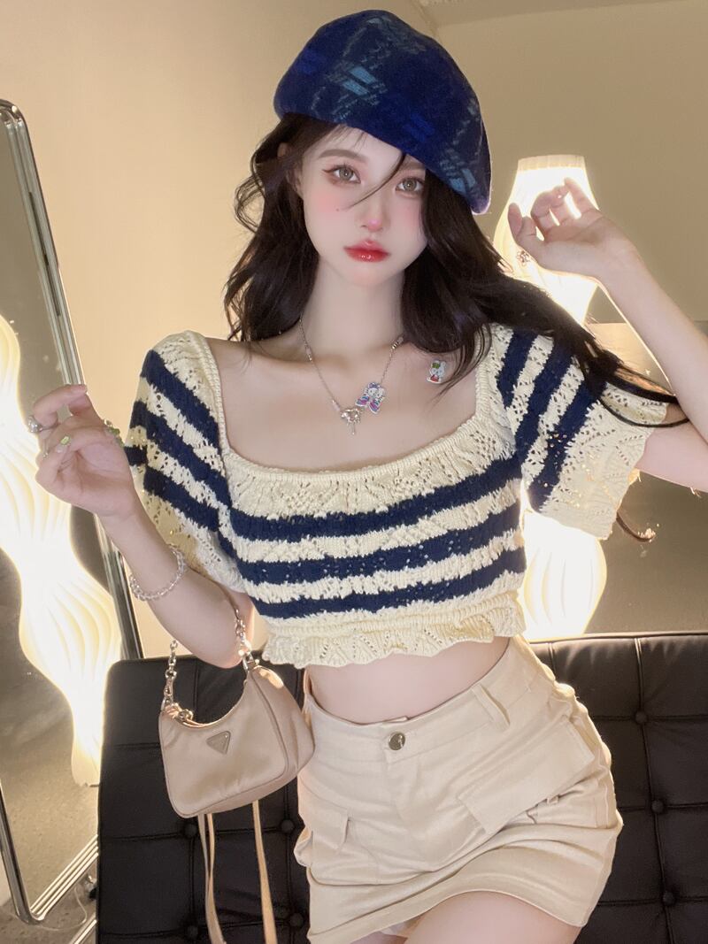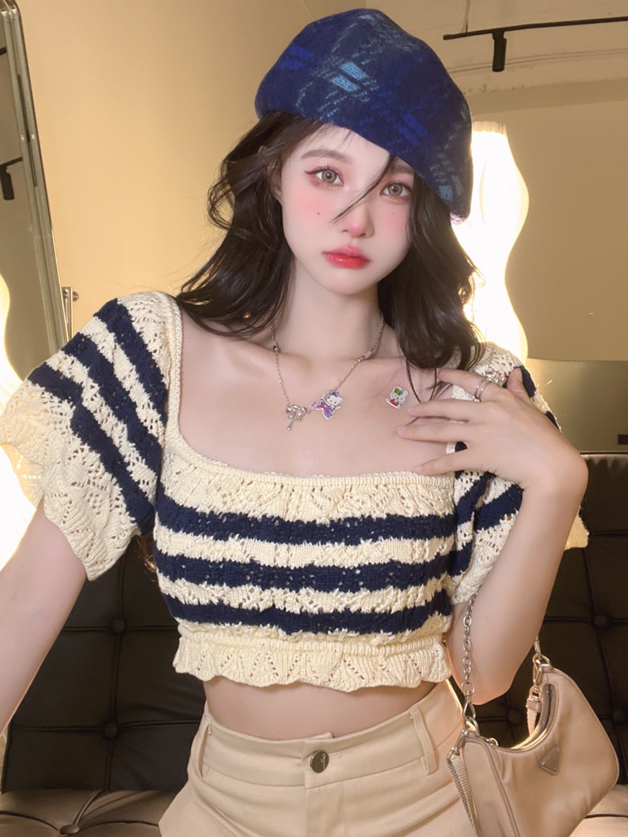 甘いスパイスストライプ半袖ニットセーター女性の夏の薄いセクションスリムフィットと薄い気質のショートトップボトムシャツへの純粋な欲望 ハーフスリーブ 大人ガーリー スウィート キュート カジュアル サマー 夏物 ピュア bstraw20564498371 | beaute25