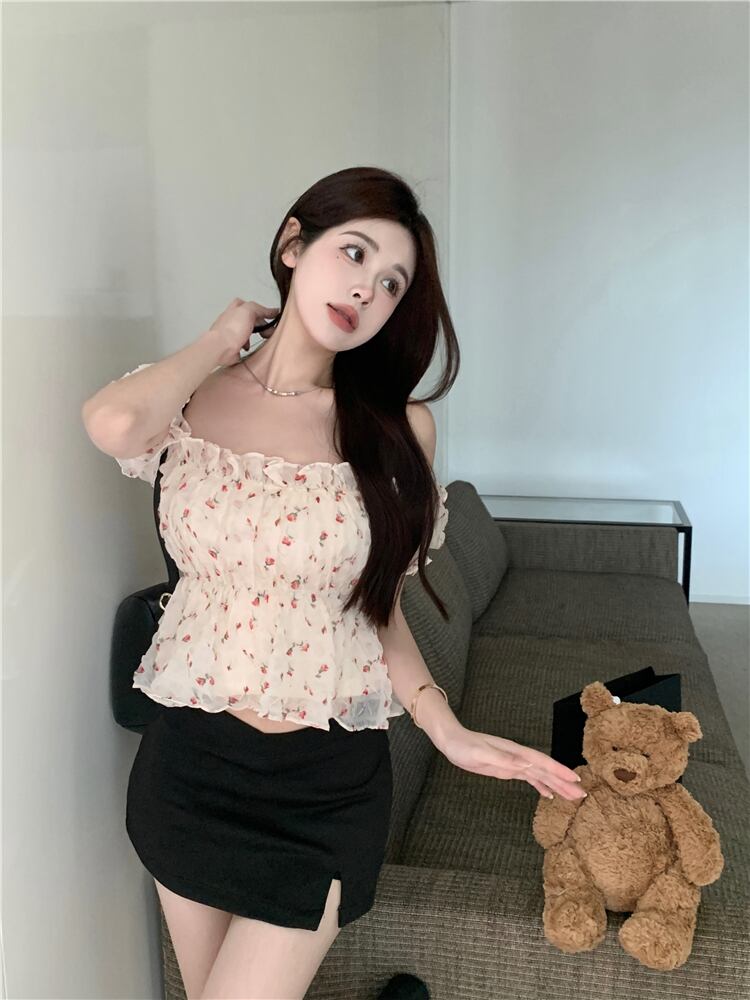 スウィートフローラル半袖シフォンシャツレディースサマースモールスウィートシックワンショルダーセクシーショートトップ 大人ガーリー キュート カジュアル 夏物 花柄 bstraw82461349985 | beaute25