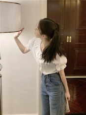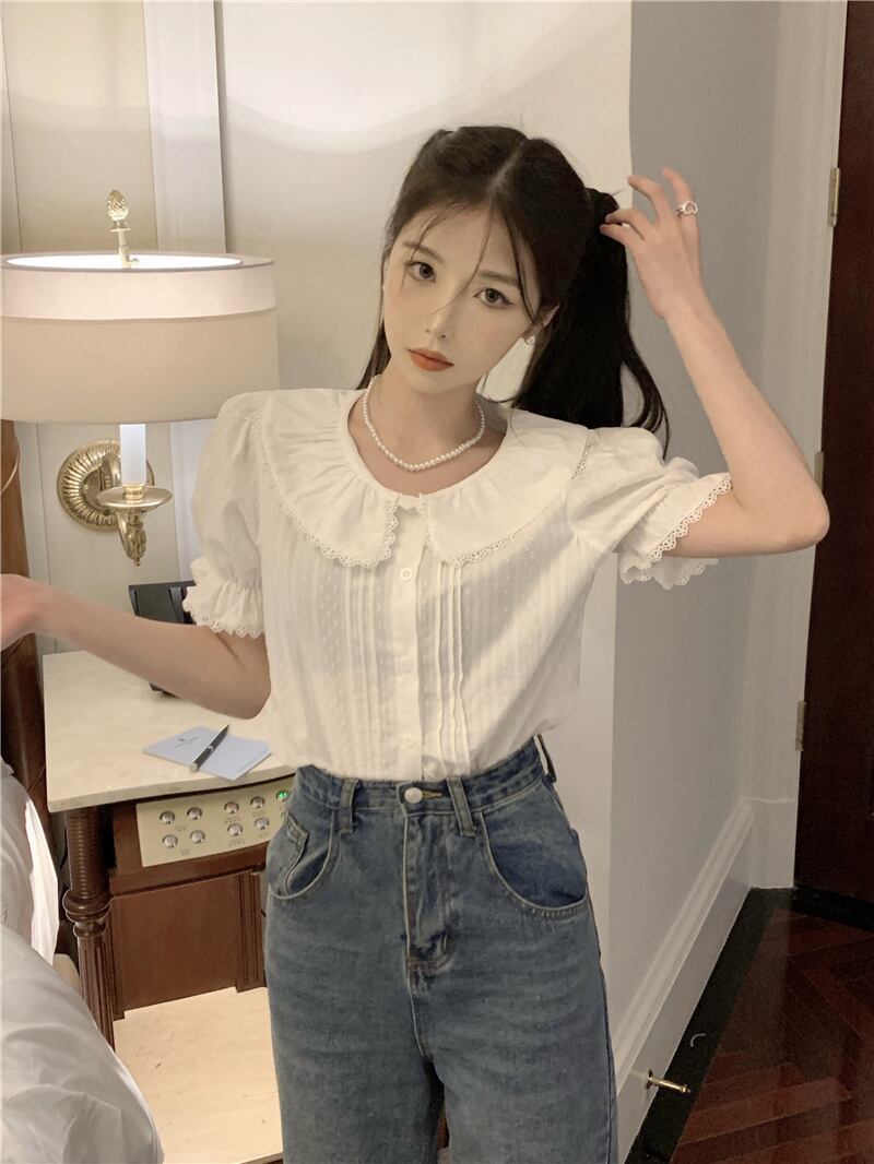 ドールカラーシャツレディースサマーレーススウィートエイジリデューシングパフスリーブシャツスモールスモールショートトップ 大人ガーリー キュート カジュアル 夏物 bstraw9801960248 | beaute25