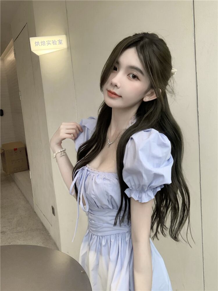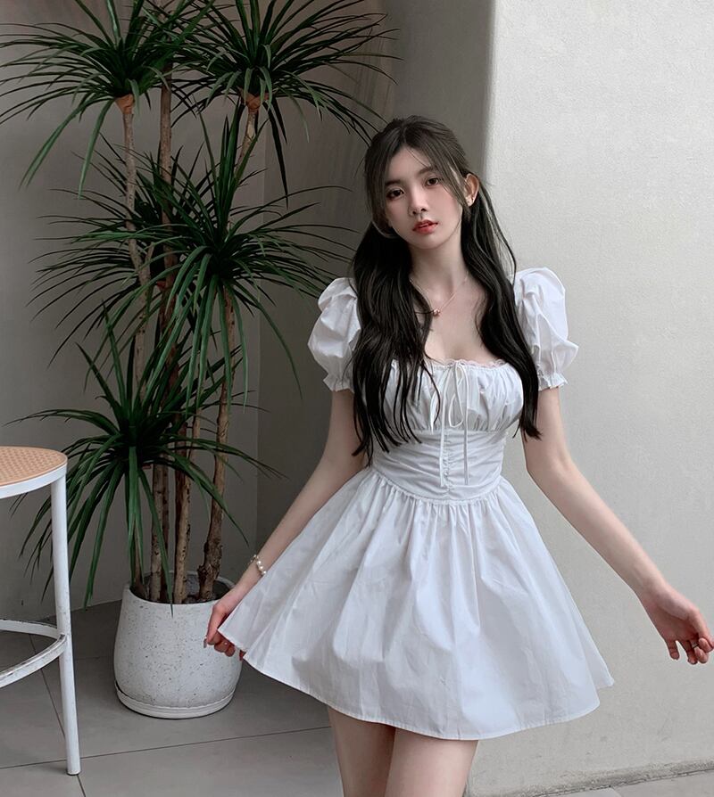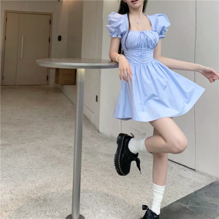 フランスの甘い半袖ドレス女性の2022年夏の新しいスクエアネック気性ウエスト初恋プリンセスショートスカート 大人ガーリー スウィート キュート カジュアル サマー 夏物 スクウェア bstraw22190526270 | beaute25