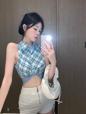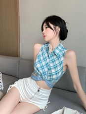 ブルーのチェック柄ノースリーブキャミソールレディースサマースウィートでピュアなデザインセンスでトップスを着て外で着る ショート 大人ガーリー キュート カジュアル 夏物 bstraw97952661438 | beaute25