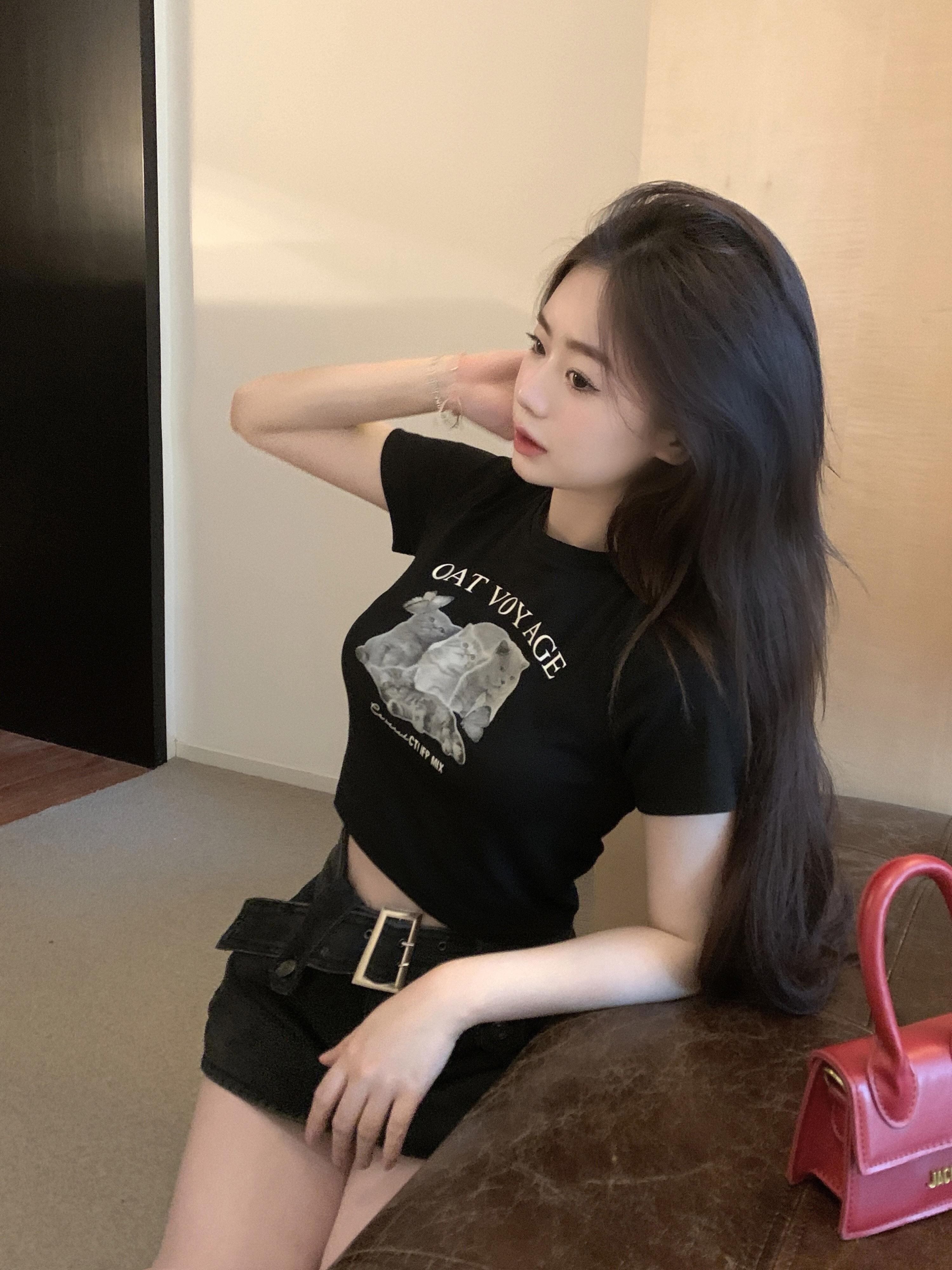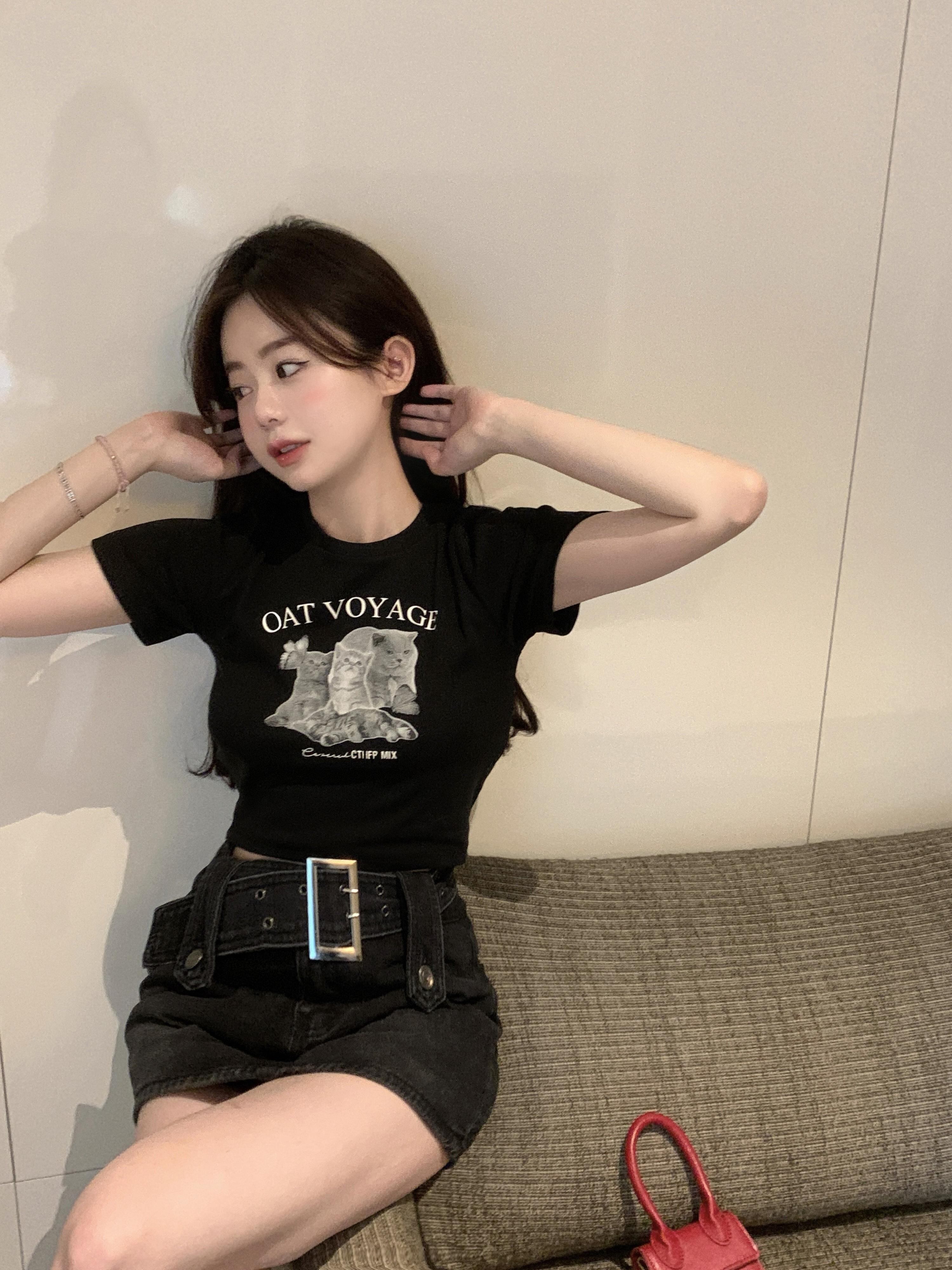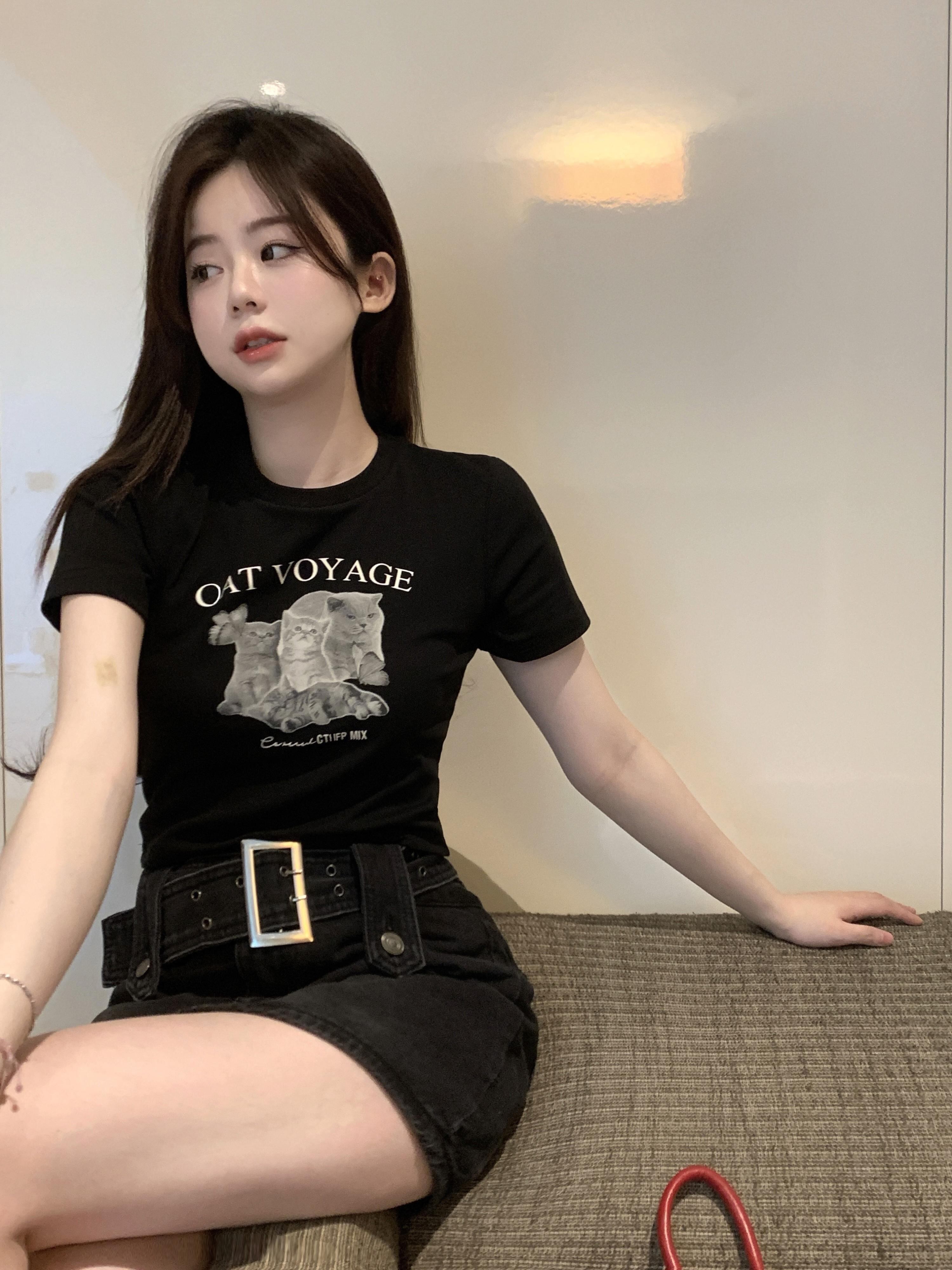 黒猫プリント半袖Tシャツサマーイントレンディショートセクション甘くてかっこいいスリムクロップトップ ブラック 大人ガーリー スウィート キュート カジュアル 夏物 bstraw4831643909 | beaute25