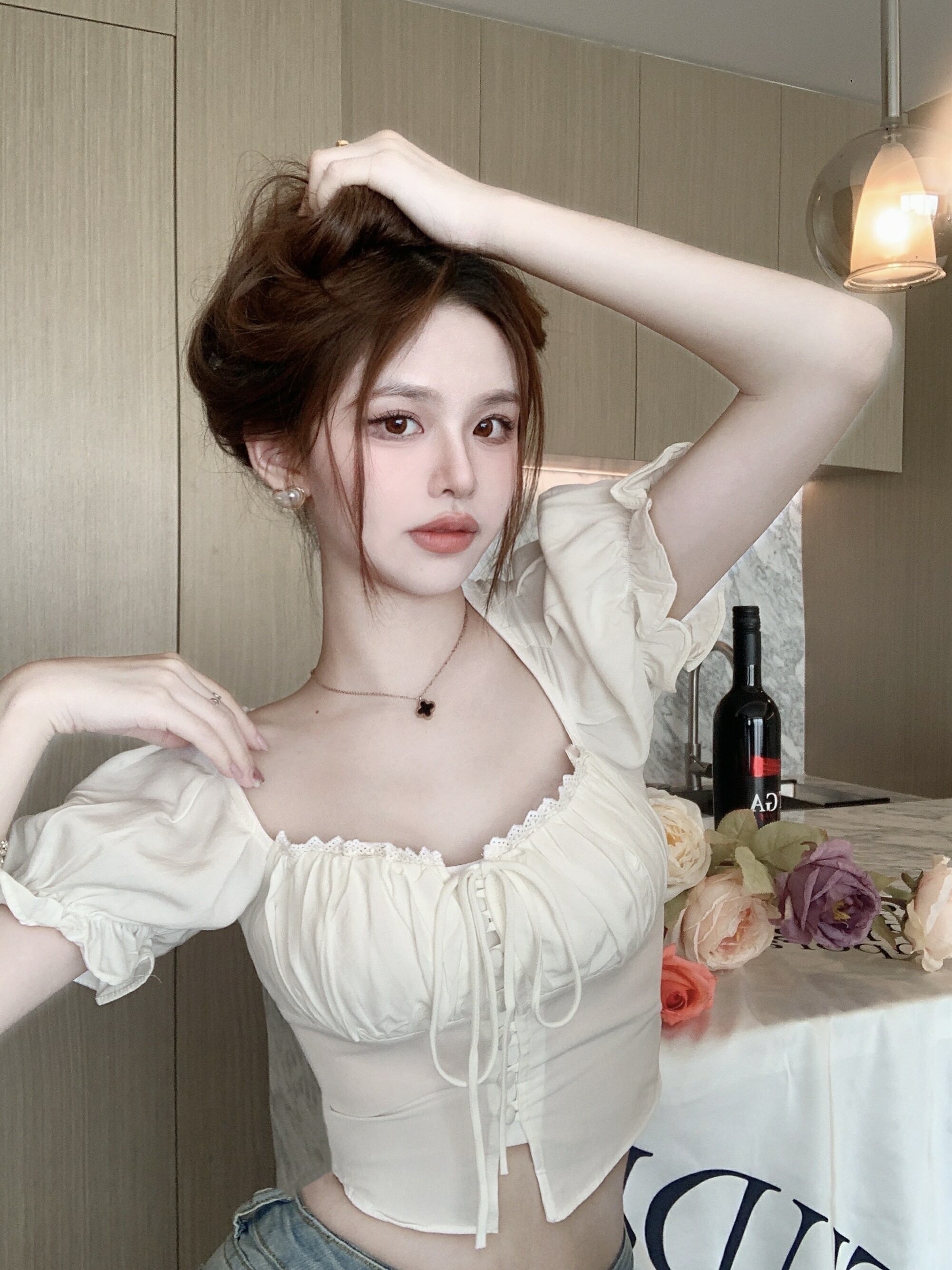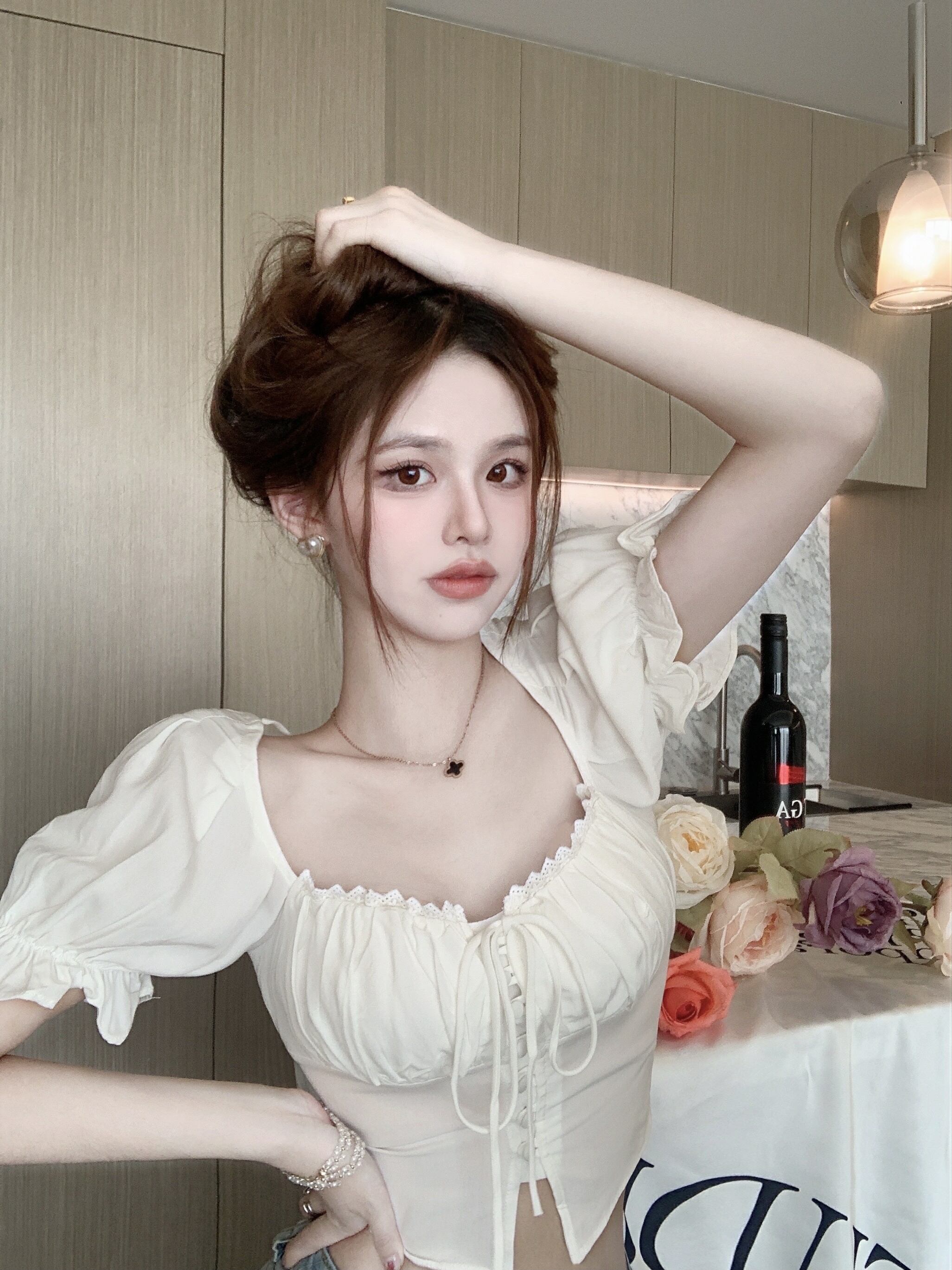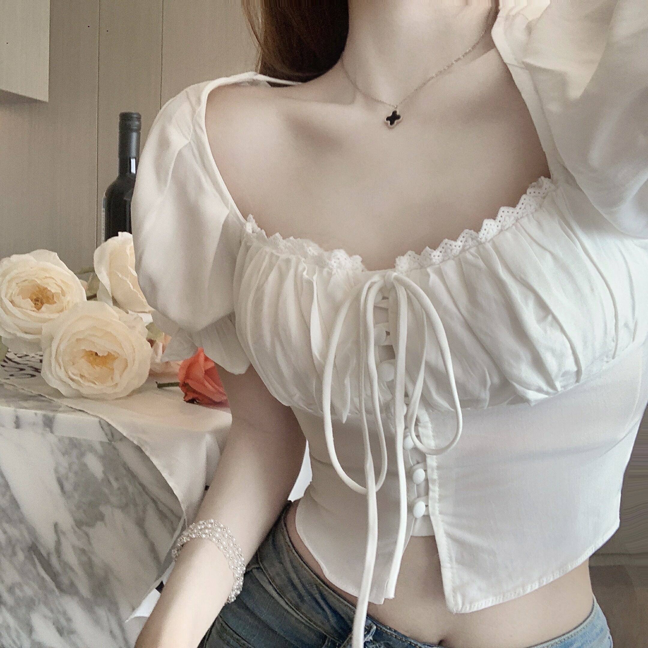 フレンチボウ半袖シャツレディースサマーピュアデザイアスリムシャツスクエアネックショートセンシュアルスモールトップ リボン ハーフスリーブ 夏物 スクウェア bstraw15027844091 | beaute25